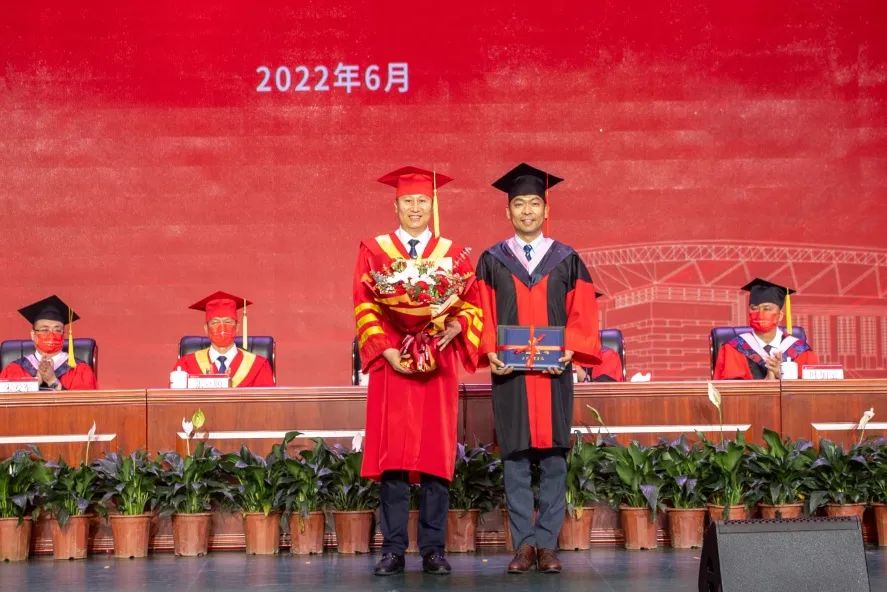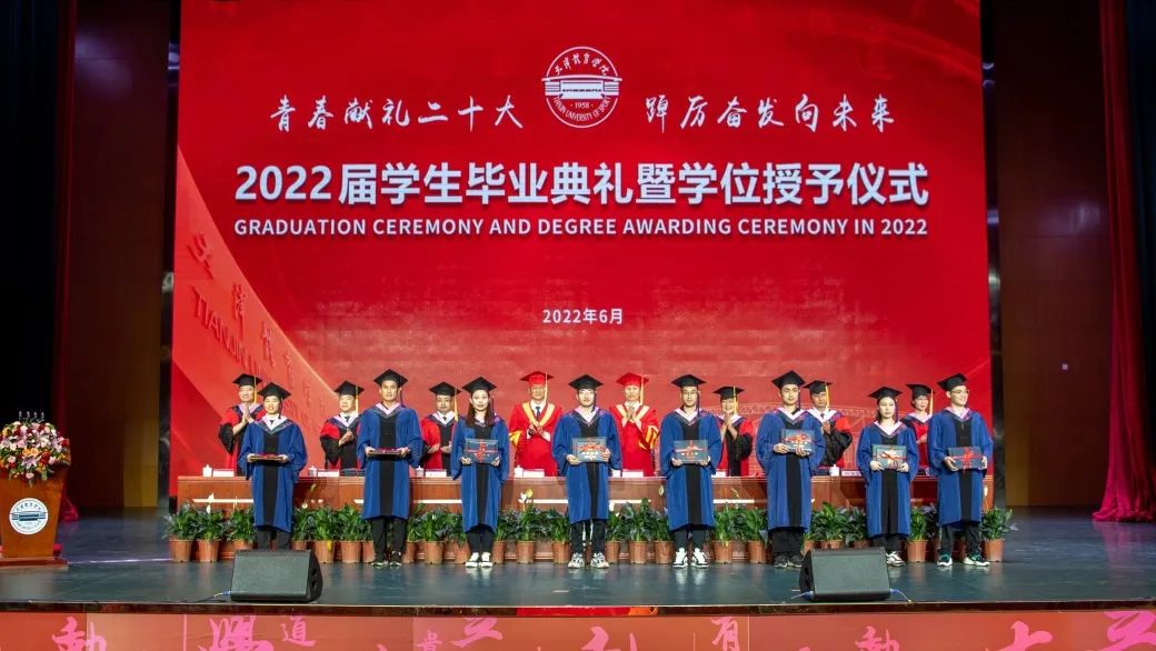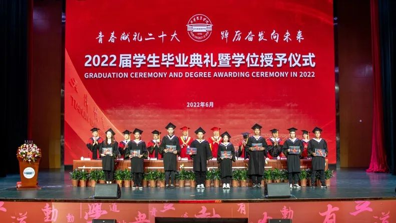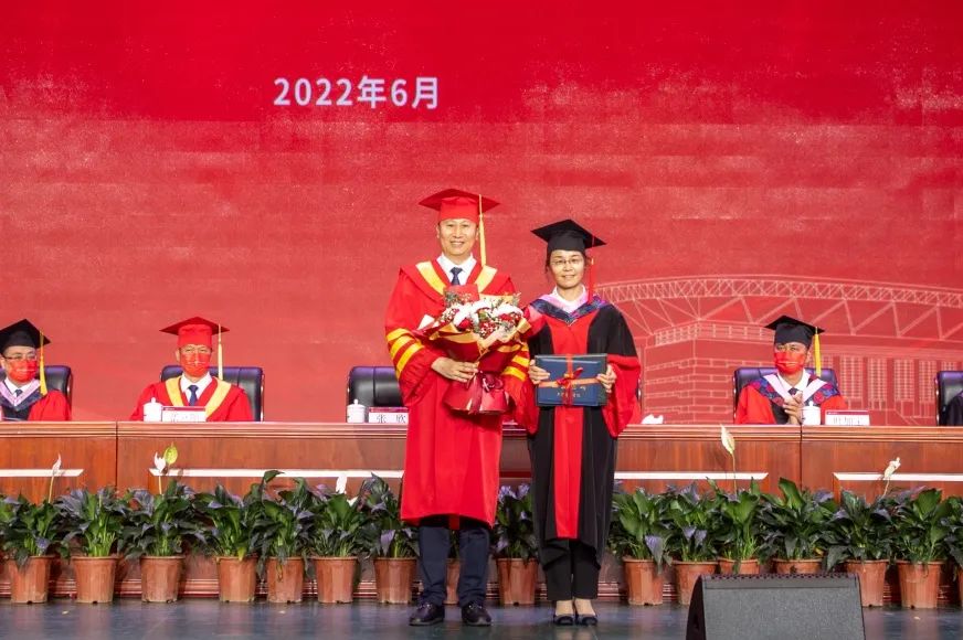 毕业典礼在升国旗仪式中拉开帷幕。宋爱军宣读天津体育学院2022届优秀毕业生表彰决定。教务处处长金宗强宣读天津体育学院2022届本科毕业生学位授予决定。科研与研究生处处长徐金陆宣读天津体育学院2022届硕士、博士毕业生学位授予决定。主席台就坐领导向优秀毕业生代表颁发荣誉证书和纪念品,向本科、硕士毕业生代表颁发了学位证书和毕业证书。张欣为到场的3名博士毕业生代表颁发了学位证书和毕业证书。
