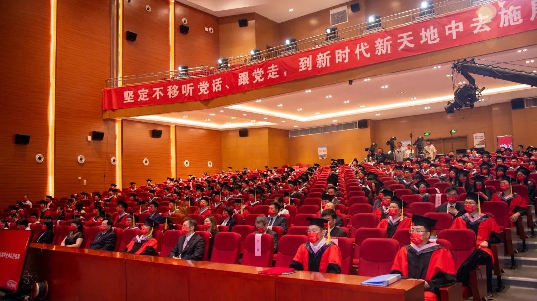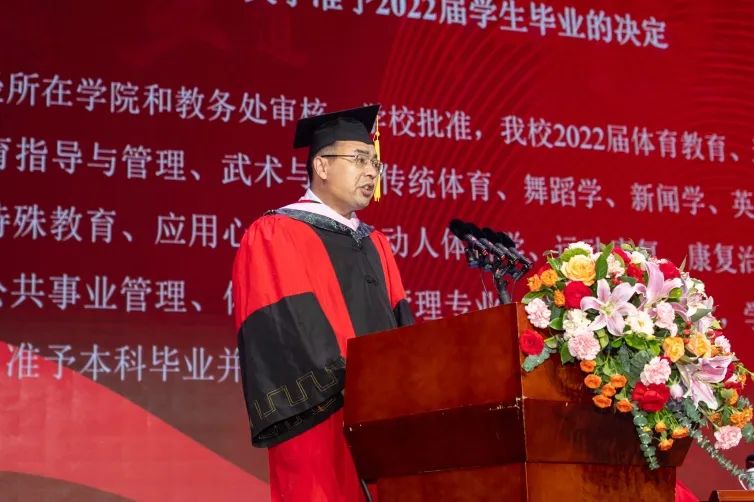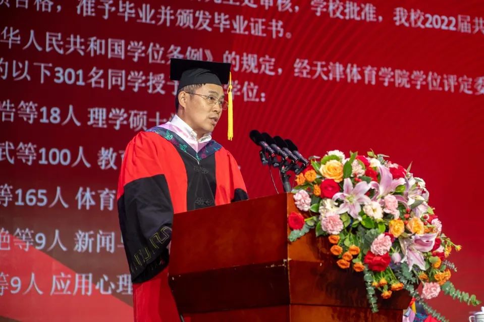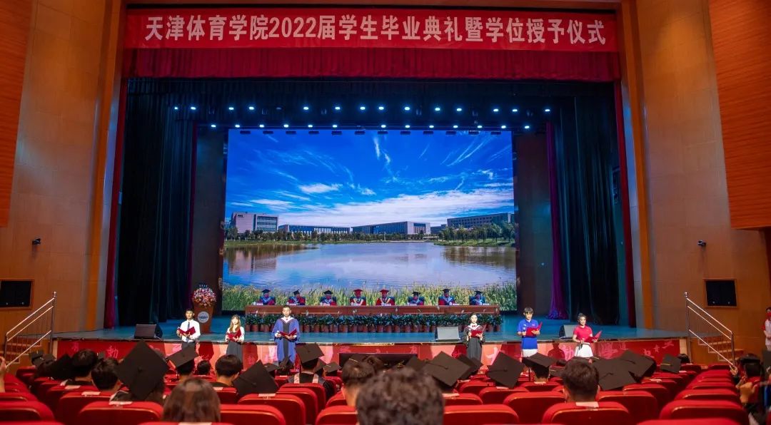 青春献礼二十大,踔厉奋发向未来。天津体育学院2022届学生毕业典礼暨学位授予仪式于2022年6月28日在大学生活动中心报告厅隆重举行。天津体育学院党委书记张立顺,党委副书记、院长张欣,党委常委、副院长宋爱军,党委常委、市纪委监委驻天津体育学院纪检监察组组长张洺涛,党委常委、组织部部长叶加宝,党委常委、宣传部部长刘原,党委常委、统战部部长依惠琴出席毕业典礼。学校各党政部门、教辅单位主要负责同志,各二级教学单位全体班子成员,全体教研室主任、研究生导师、辅导员,以及全体2022届毕业生在线下和“云端”齐聚一堂,共同欢庆毕业盛典。毕业典礼由党委常委、副院长张卫国主持。