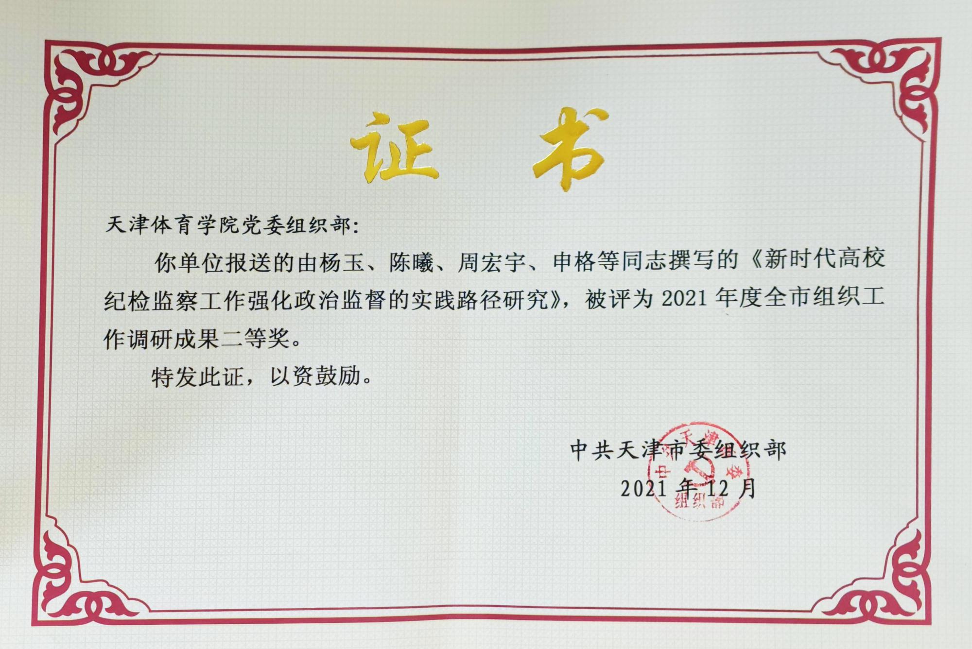 日前,市委组织部公布2021年度全市组织工作课题调研成果获奖情况,我校社会体育与健康科学学院党委副书记、纪委书记杨玉同志作为课题负责人上报的《新时代高校纪检监察工作强化政治监督的实践路径研究》,荣获天津市2021年度组织工作调研成果二等奖。