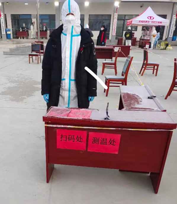 刘雯,2020级乒乓球专项学生,在西青区大寺镇隆顺园负责居民信息录入和核酸检测现场秩序维护。