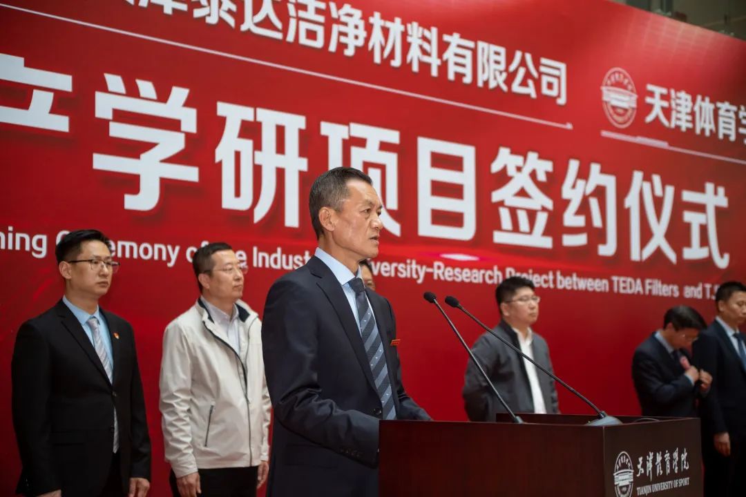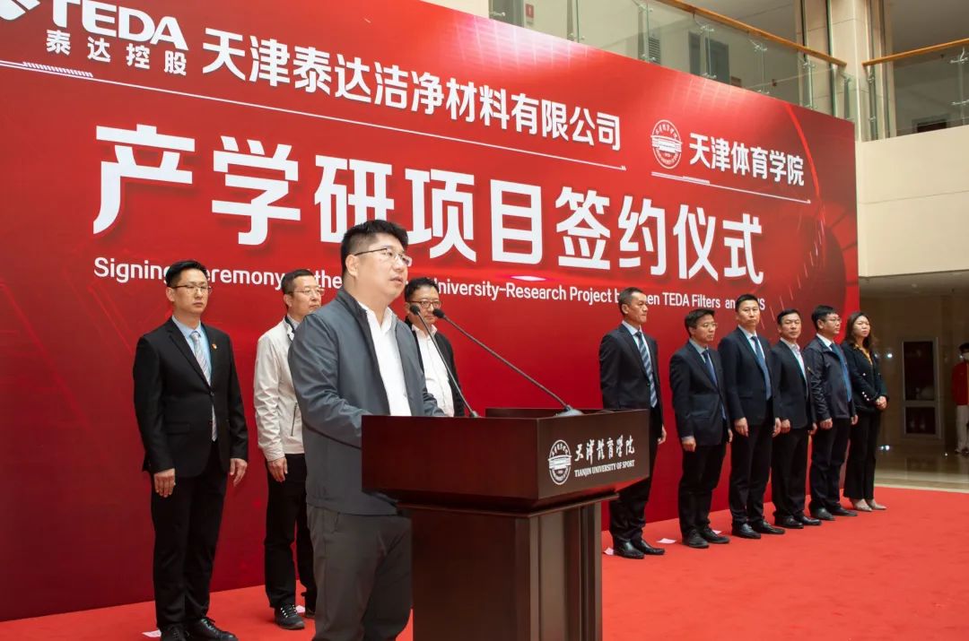 天津泰达股份有限公司党委书记、董事长张旺在致辞中表示,天津体育学院与天津纺织集团和泰达洁净,就运动口罩研发开展了产学研用合作,通过三方努力,在运动口罩研发方面取得了明显的成果。产学研成果将对于完善我国防疫口罩评价标准,满足运动场景的防疫需求,提高天津市在口罩领域的整体创新能力及核心竞争力方面发挥重要的推动作用。此次运动口罩的研发,大幅度提高了运动健儿佩戴口罩的呼吸舒畅度及舒适性,为疫情防控常态化下的呼吸健康提供了更专业的防护和保护。泰达洁净材料有限公司与天津体育学院,将深化校企合作体制创新,为科学研究、成果转化发挥积极作用,为区域经济社会发展提供强有力的科技支撑。