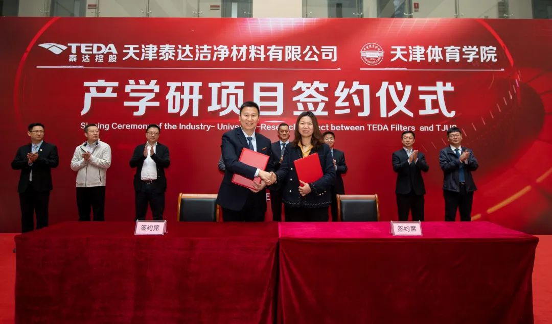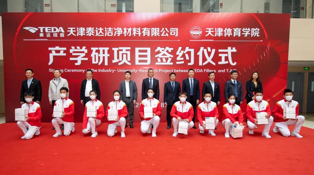 天津体育学院党委副书记、院长张欣和天津泰达洁净材料有限公司总经理谢敬伟签约。与会领导向试训学生代表赠送口罩。