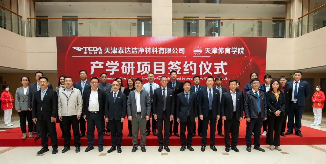 2022年10月18日,天津体育学院与天津泰达洁净材料有限公司产学研项目签约仪式在我校团泊校区乒羽馆举行。天津纺织集团(控股)有限公司总经理葛传兵,天津泰达股份有限公司党委书记、董事长张旺,党委副书记孙国强,副总经理马剑,天津泰达洁净材料有限公司党支部书记、董事长宋逍,天纺标检测认证股份有限公司总经理吕刚,天津泰达洁净材料有限公司总经理谢敬伟、财务总监郑天岳,天津体育学院党委书记张立顺,党委副书记、院长张欣,以及天津体育学院相关职能部门、二级学院负责人出席签约仪式。签约仪式由天津体育学院党委副书记宋爱军主持。