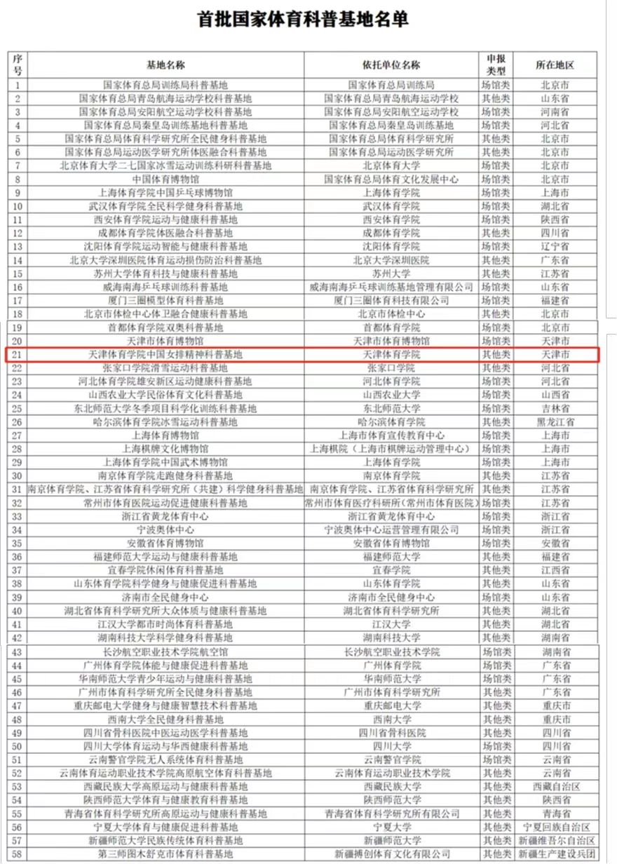 近日,国家体育总局和科学技术部公布首批国家体育科普基地名单。经过组织推荐、专家评审、公示命名等环节,天津体育学院中国女排精神科普基地获批首批国家体育科普基地。