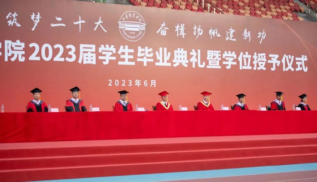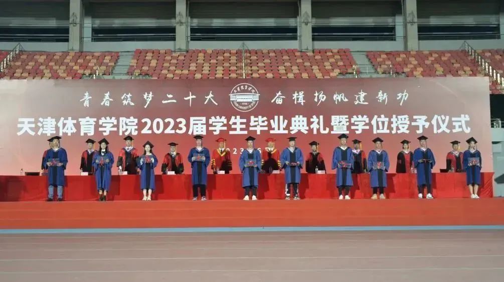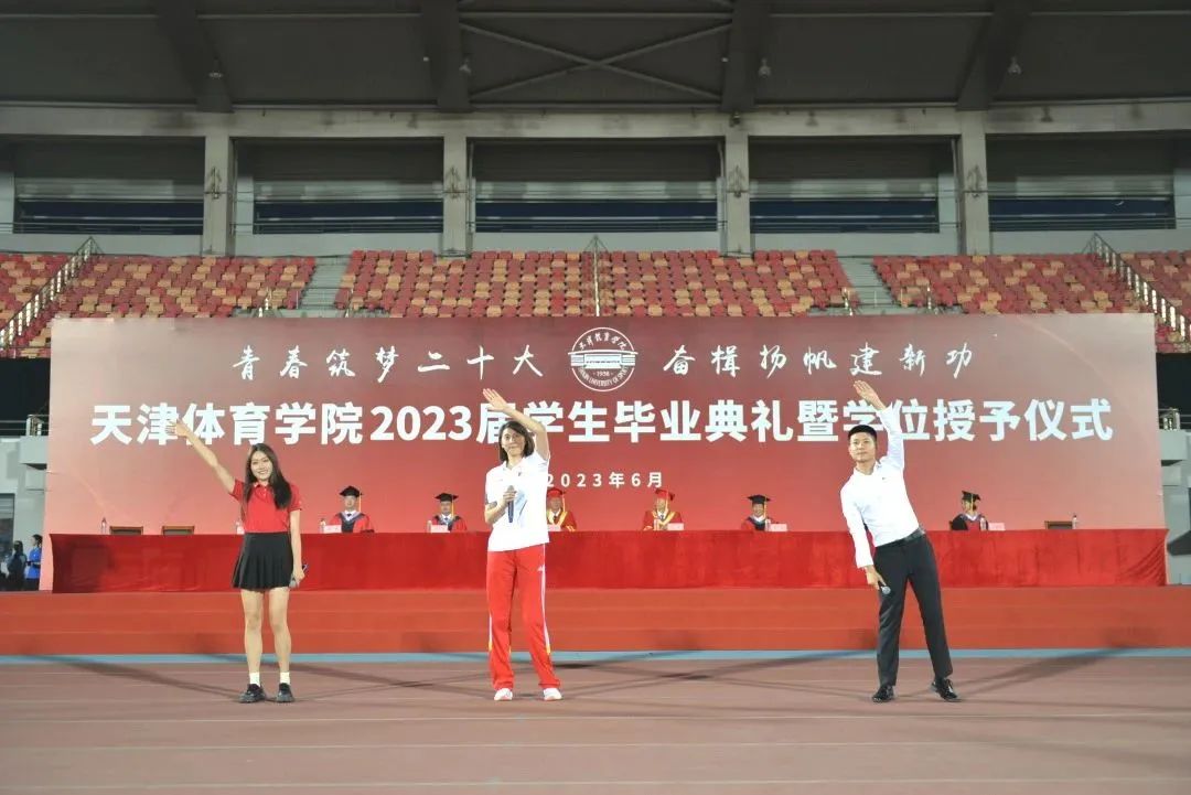 青春筑梦二十大,奋楫扬帆建新功。天津体育学院2023届学生毕业典礼暨学位授予仪式于2023年6月20日晚在田径场隆重举行。天津体育学院党委书记张立顺,党委副书记、院长张欣,党委常委、副书记宋爱军,党委常委、副院长张卫国,党委常委、副院长杨智,党委常委、组织部部长叶加宝,党委常委、宣传部部长刘原,党委常委、统战部部长依惠琴出席毕业典礼。学校各相关职能部门主要负责同志,各二级教学单位领导班子成员,全体教研室主任、研究生导师、辅导员,学生家长代表、往届毕业生代表,以及全体2023届毕业生齐聚一堂,共同欢庆毕业盛典。毕业典礼由宋爱军主持。