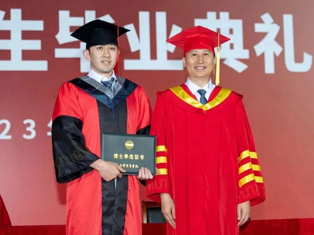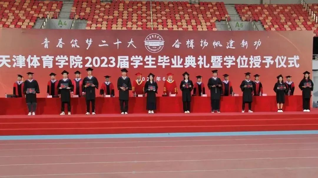 学位授予仪式中,教务处副处长杨公安宣读天津体育学院2023届本科毕业生名单,科研与研究生处处长岳游松宣读天津体育学院2023届硕士、博士毕业生名单,主席台就坐领导为本科、硕士毕业生代表颁发学位证书和毕业证书,张欣为到场的博士毕业生代表颁发学位证书和毕业证书。