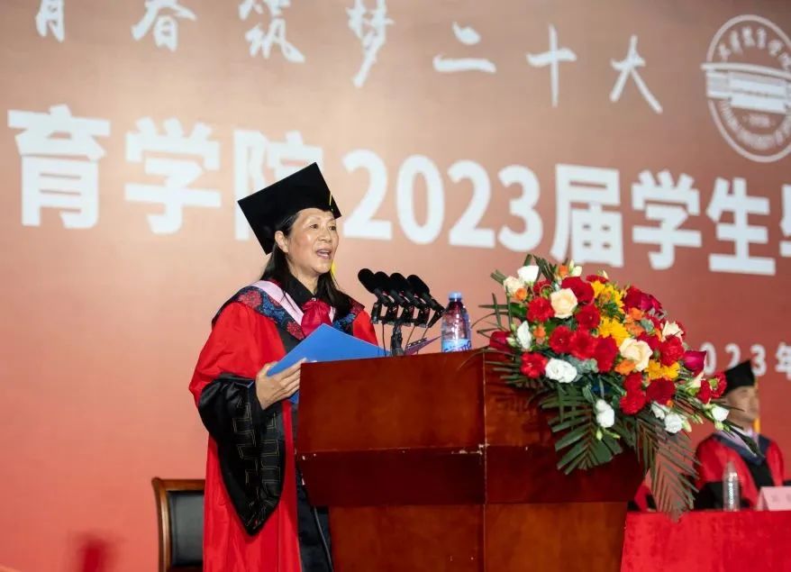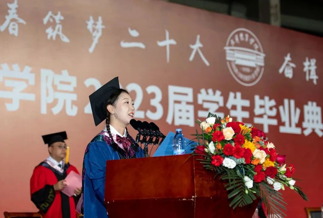 传媒与艺术学院(国际教育学院)院长马桂霞作为教师代表发言,表达了对2023届毕业生的衷心祝贺与真诚祝福,鼓励同学们树立远大理想,拼搏奋斗,描绘出彩人生。