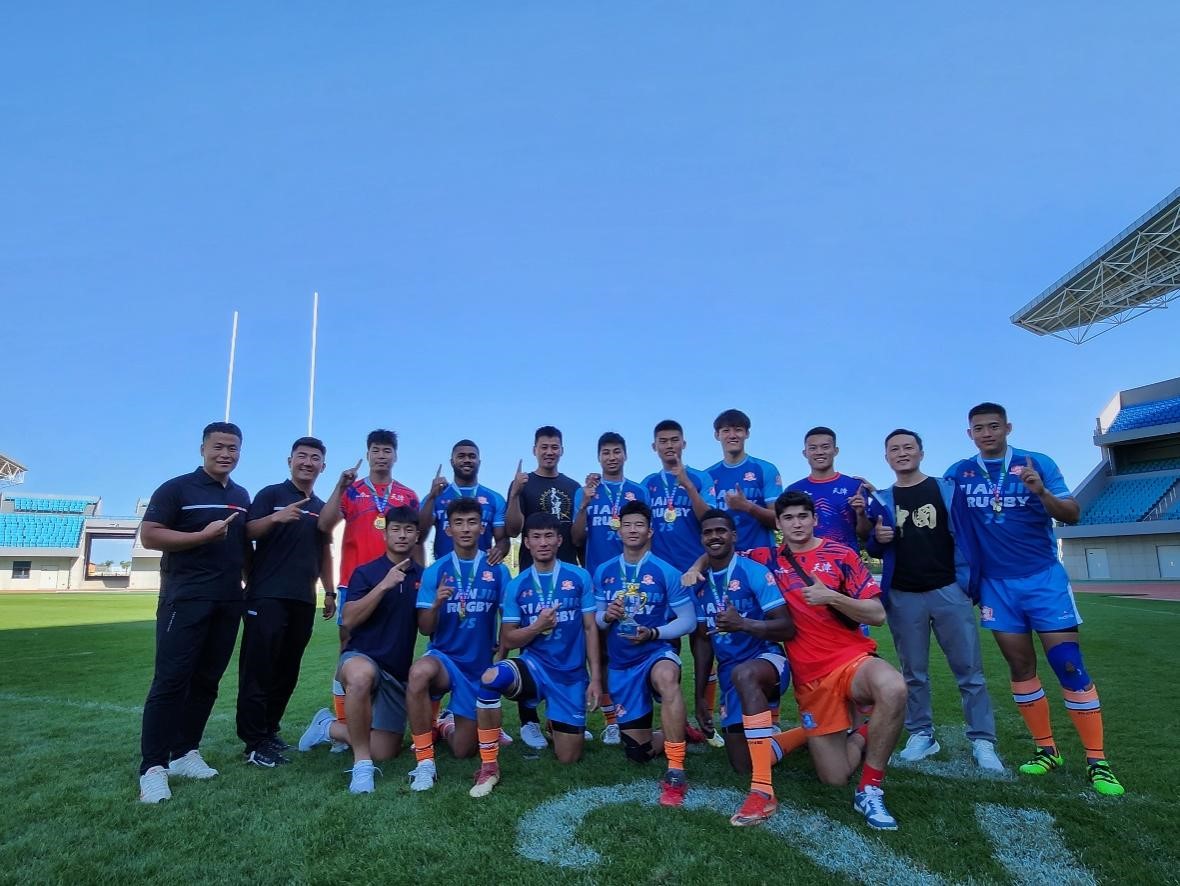 我校橄榄球代表队由主教练刘冠军带队,共15名运动员参加此次比赛。比赛中,我校运动员继续发挥上一站的优势,再接再厉,在总结上一站成功经验的基础上,稳扎稳打,认真打好每一场比赛,充分发挥自身体能和技战术优势,展现出我校运动员顽强拼搏、奋勇争先的精神风貌。最终,经过2天鏖战,我校橄榄球队卫冕2023年全国英式7人制橄榄球系列积分赛呼和浩特站冠军。