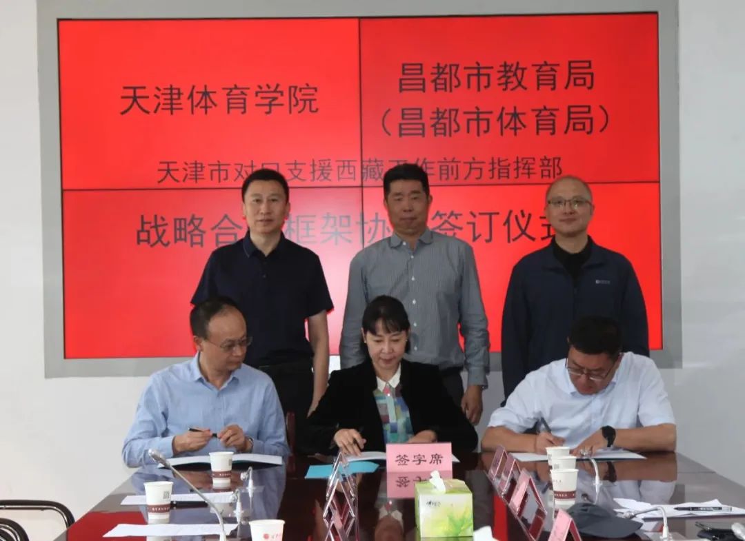 8月19日,在西藏昌都市,学校与天津市对口支援西藏工作前方指挥部、昌都市教育(体育)局签署战略合作三方协议,围绕教育教学质量提升、科研实训平台建设、援藏干部健康指导和青少年竞技体育后备人才培养等开展战略合作。天津市合作交流办公室副主任王东,天津体育学院党委副书记、院长张欣,天津市对口支援西藏工作前方指挥部总指挥张建华,昌都市教育局党组书记干宇出席签约仪式。张欣表示,三方签署战略合作协议是全面提升昌都市教育发展水平、服务教育强国建设的必然要求,天津体育学院将深入贯彻落实习近平总书记关于教育的重要论述和关于西藏工作的重要指示,全面服务昌都市所需,共同促进昌都市办学条件、办学理念、办学能力、师资队伍水平、育人效果显著提高,确保教育援藏工作不断取得新成效。