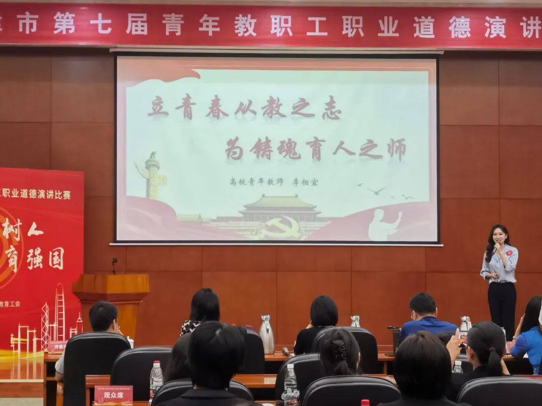 为深入学习贯彻习近平新时代中国特色社会主义思想和党的二十大精神,大力弘扬劳模精神、工匠精神,教育引导全市广大教职工涵养职业道德、建设教育强国,9月26日,天津市教育工会组织举办天津市第七届青年教职工职业道德演讲比赛,共有全市29所高校附院、16个区教育工会的44名选手参赛,我校教师李相宜代表学校参赛。经过全天九个小时的赛程,李相宜在激烈的角逐中以动人的讲述风格、精湛的演讲水平、出色的现场发挥斩获一等奖。