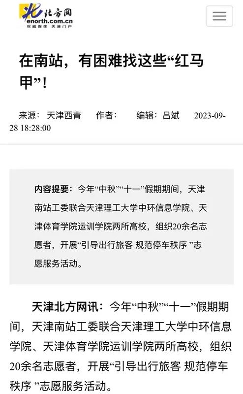 近日,我校运动训练学院“思韵悠长、真理远航”理论宣讲团队志愿者在天津南站开展“引导出行旅客、规范停车秩序”等志愿服务活动,助力天津“十项行动”,保障假期旅客安全出行。北方网、西青区官方微信“天津西青”对我校志愿者活动进行了报道。