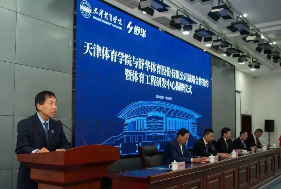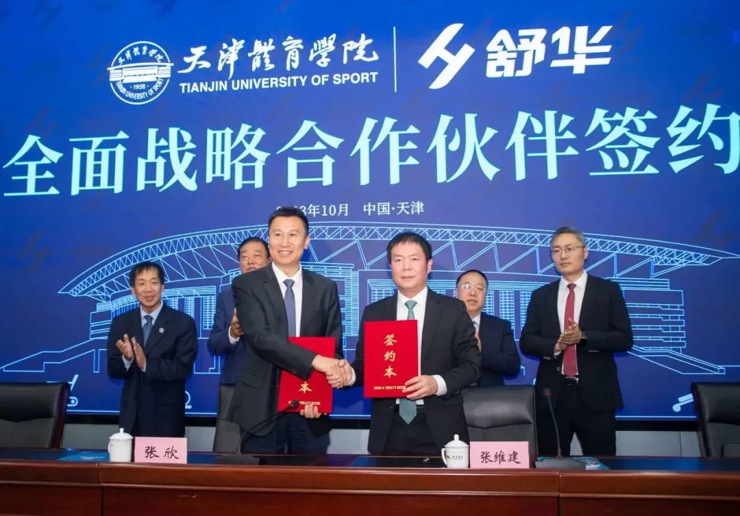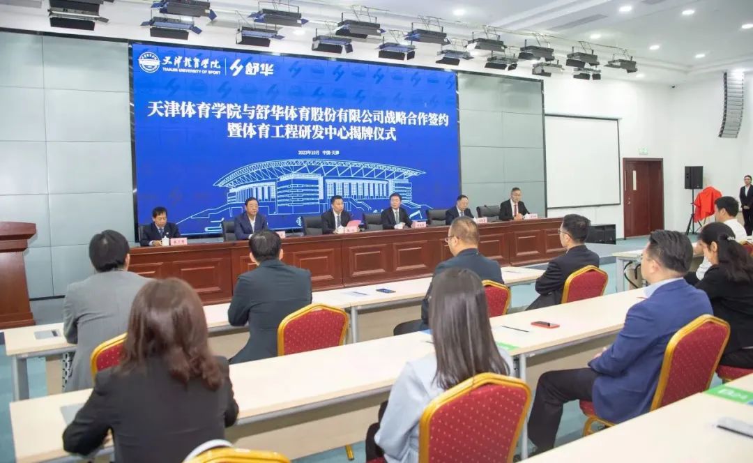 2023年10月10日,天津体育学院与舒华体育股份有限公司战略合作签约暨体育工程研发中心揭牌仪式举行。天津市体育局副局长、一级巡视员王路华,市委教育工委委员、市政府教育督导室总督学王秋岩,舒华体育股份有限公司总裁张维建、副总裁李晓峰,天津体育学院党委副书记、院长张欣出席。天津体育学院相关职能部门负责人,各二级学院院长、科研副院长及师生代表,舒华体育股份有限公司相关部门负责人参加。签约仪式由天津体育学院副院长张卫国主持。