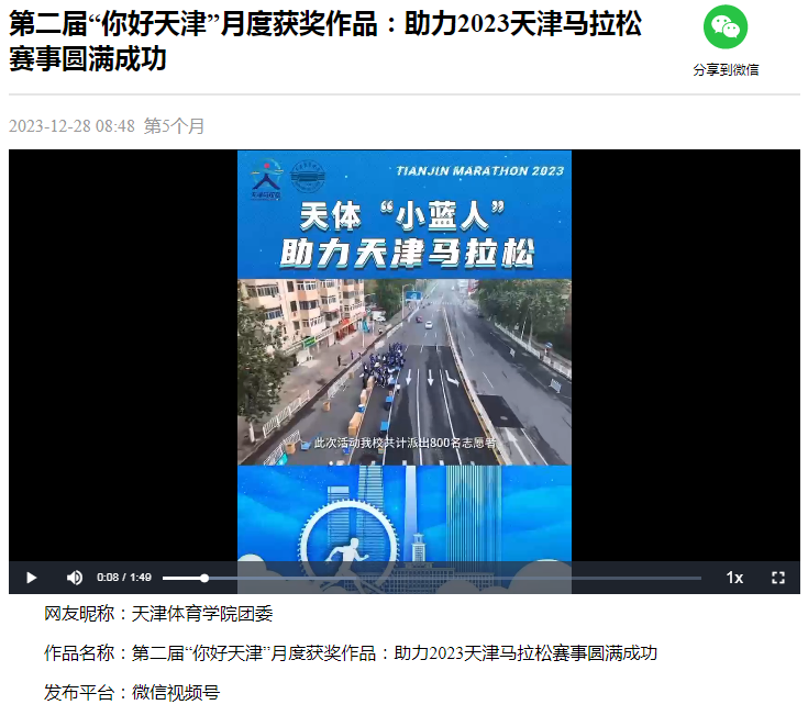 日前,第二届“你好,天津”网络短视频大赛第五个月赛评选结果揭晓,我校团委微信视频号作品《助力2023天津马拉松赛事圆满成功》入围月度优秀作品。