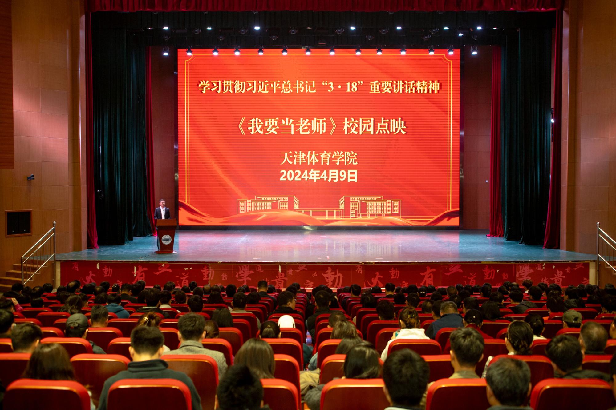 为深入贯彻落实习近平总书记在学校思想政治理论课教师座谈会上的重要讲话精神,积极推动构建“大思政”工作格局,4月9日下午,全国首部思政课教师题材轻喜剧院线电影故事片《我要当老师》天津体育学院点映式在大学生活动中心报告厅举行。学校教职工、学生代表及天津体育学院大中小学思政课一体化共建联盟教师代表参加点映式并观看电影。活动由马克思主义学院院长高永强主持。