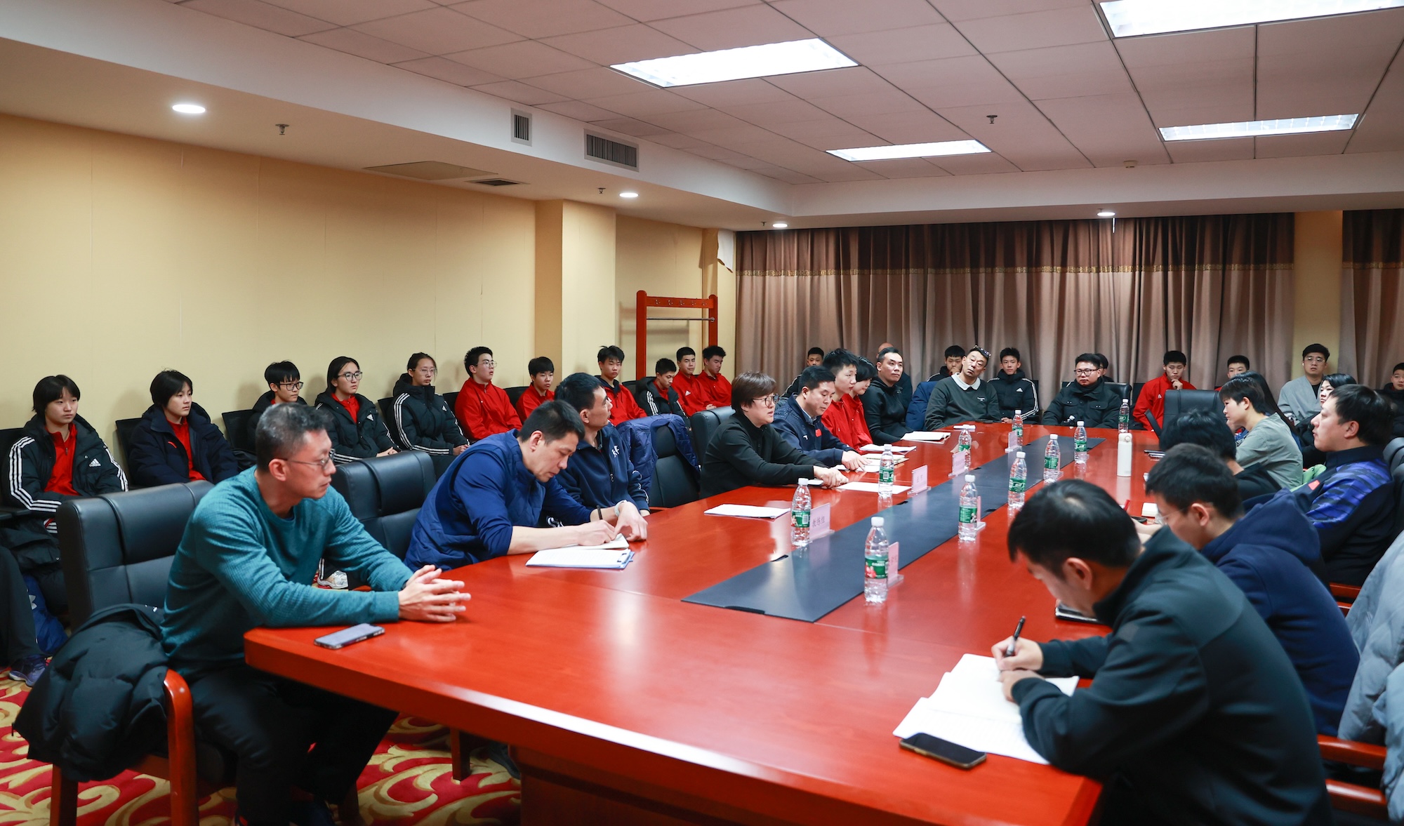 座谈中,中国排球学院直属党支部书记杨玉介绍了集训期间训练、后勤、科研、文化课学习等方面情况。教练组陈友泉、袁灵犀分别介绍了男女队训练情况,队员代表毛广宇和孙文煜分享了训练感受。史友宽教授结合全国排球大调研工作,介绍了目前我国青少年排球发展现状、存在问题和应对措施。在随后的交流环节,北京少年女排主教练张弛和天津体育运动学校男排主教练李建军分别发言,充分肯定了本次集训工作的重要意义和训练效果,并提出一些具体建议。