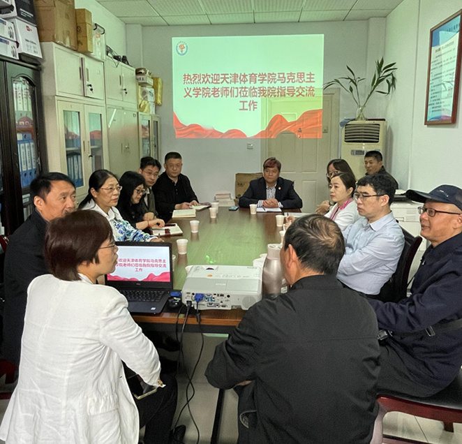 上海体育学院马克思主义学院书记、院长胡德平与各教研室主任及骨干教师同我校教师座谈交流。胡德平详细介绍了该校马克思主义学院学科建设、教学科研、实践教学等特色工作,以及积极搭建学科建设平台、多途径大力助推教学科研、积极开展馆课结合、用体育讲思政、开设系列体育特色思政选修课程,特别是举全校之力整合学科资源、成功获批马克思主义理论学科等的经验做法。