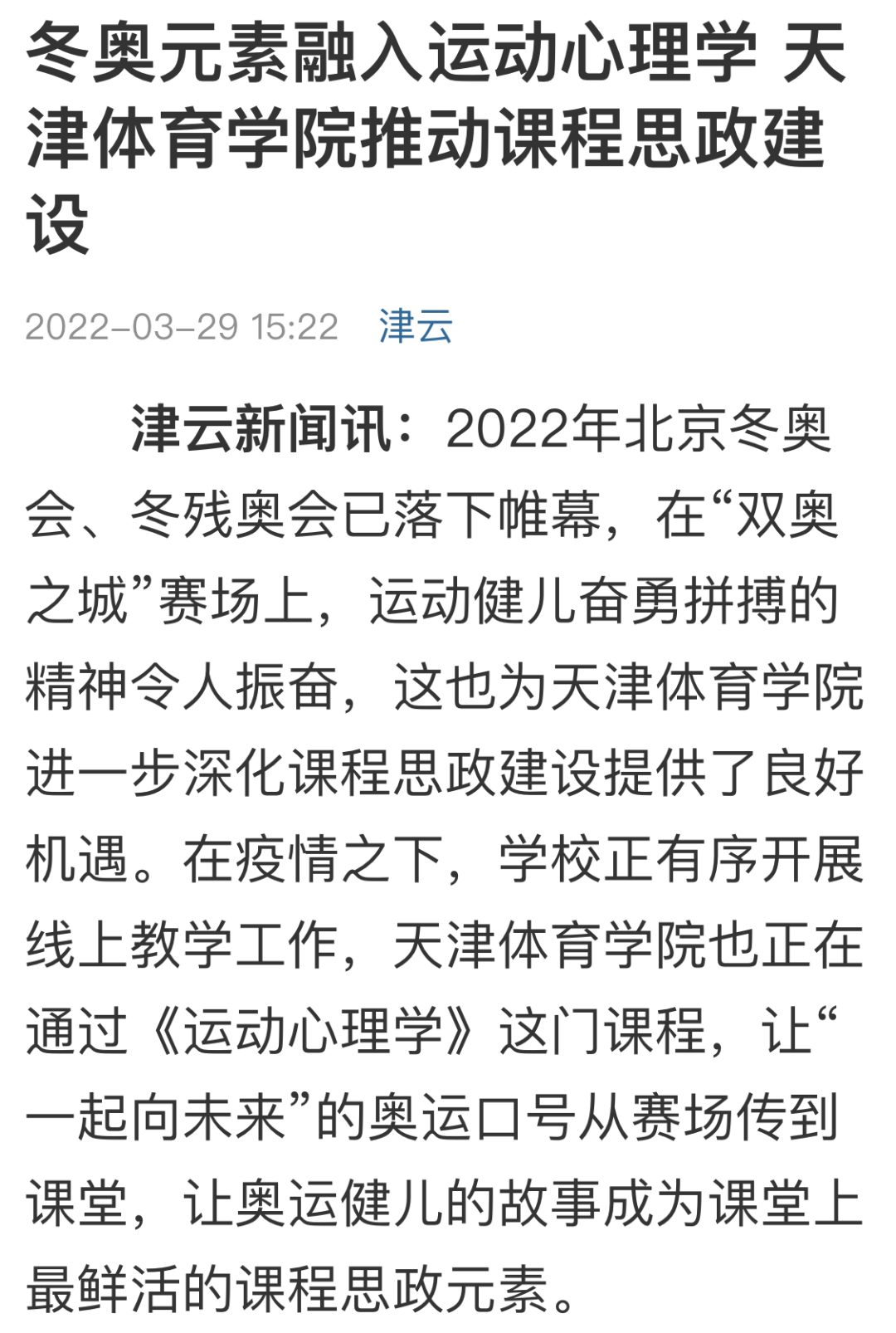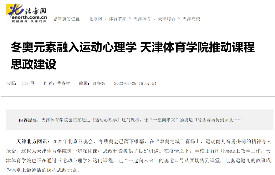 2022年3月29日,北方网、津云以“冬奥元素融入运动心理学 天津体育学院推动课程思政建设”为题,对我校进行报道,现全文转载。