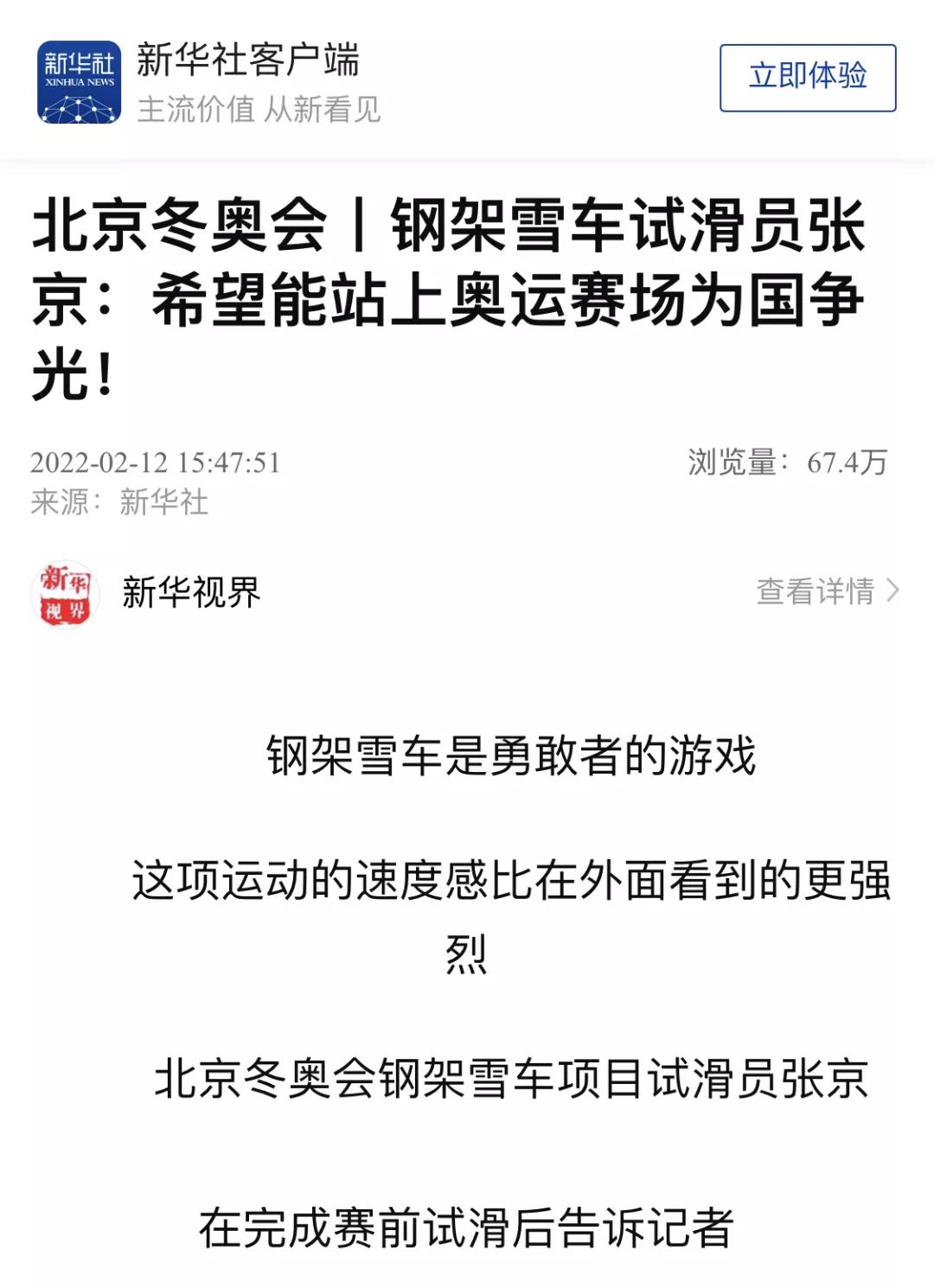 2022年2月12日,新华社客户端以“钢架雪车试滑员张京:希望能站上奥运赛场为国争光!”为题,报道我校学子张京担任北京冬奥会钢架雪车项目试滑员,为冬奥会贡献天体力量,助力中国钢架雪车队创造历史。