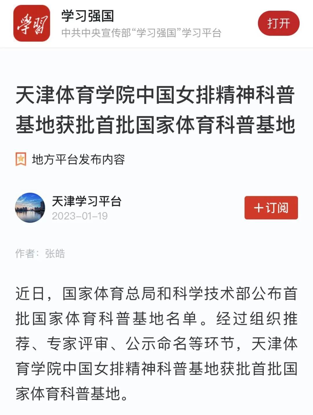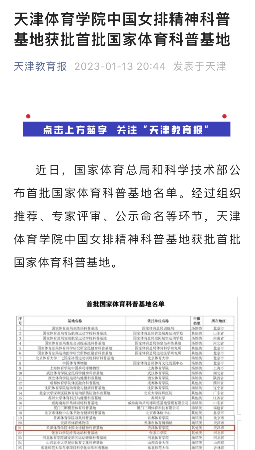 近日,国家体育总局和科学技术部公布首批国家体育科普基地名单。经过组织推荐、专家评审、公示命名等环节,我校中国女排精神科普基地获批首批国家体育科普基地。央广网、中国新闻网、学习强国、天津日报新媒体、津云、天津教育报新媒体等中央和我市多家媒体对此进行了报道。