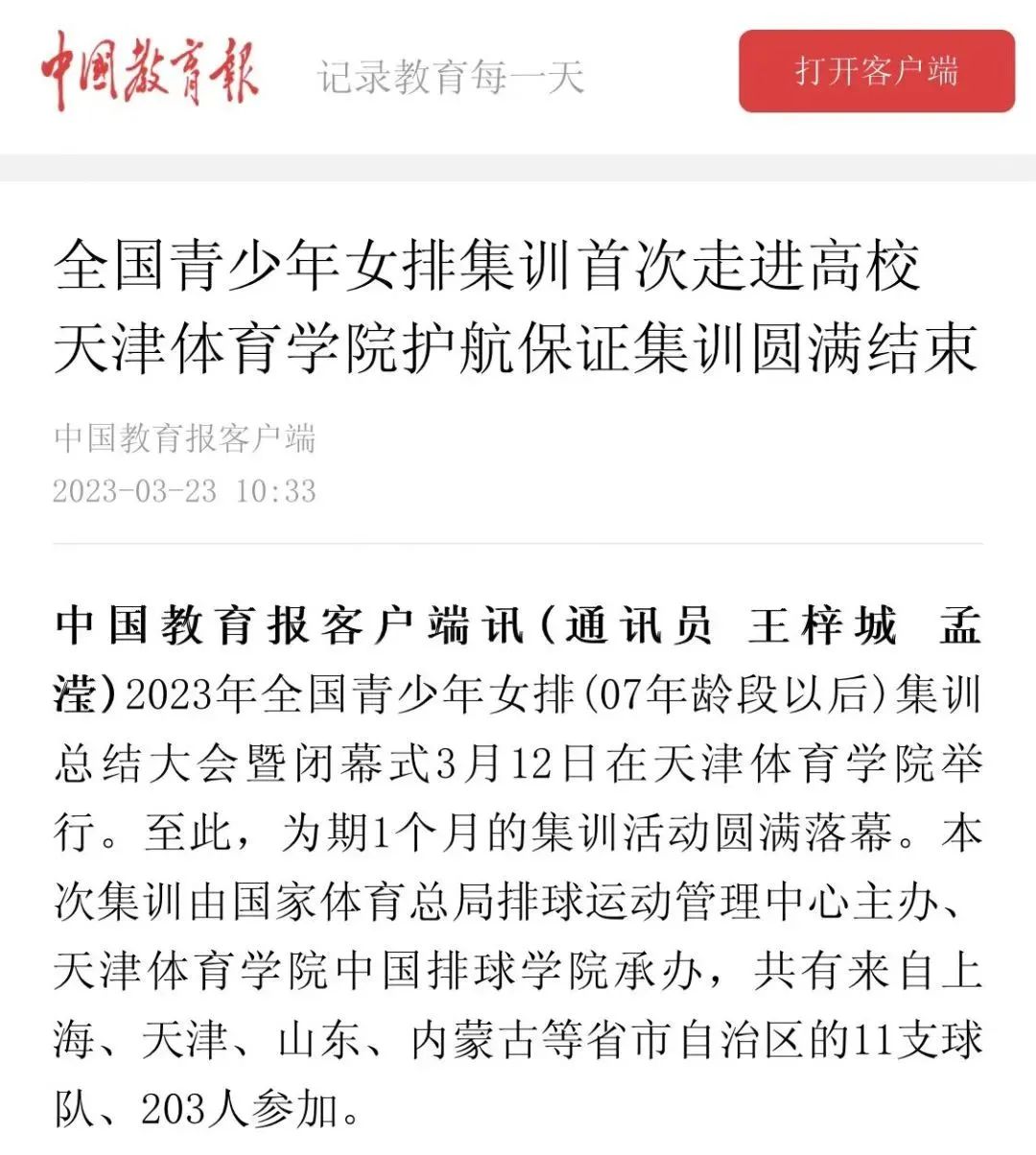 2023年全国青少年女排(07年龄段以后)集训于2月13日至3月12日在我校中国排球学院举行。这是排球运动管理中心成立以来第一次在高校举办的大集训。全国青少年女排集训期间,我校充分发挥多个学科、专业优势,为集训提供全方位保障。3月23日,中国教育报客户端以“全国青少年女排集训首次走进高校 天津体育学院护航保证集训圆满结束”为题,对此进行了报道。现全文转载。