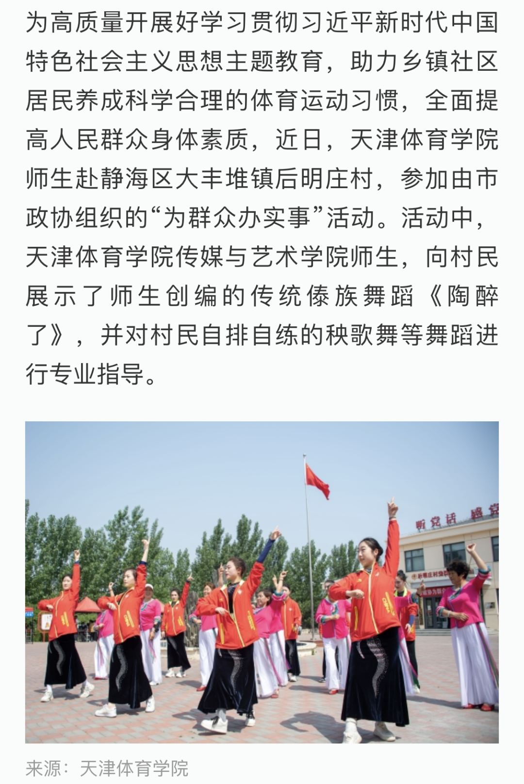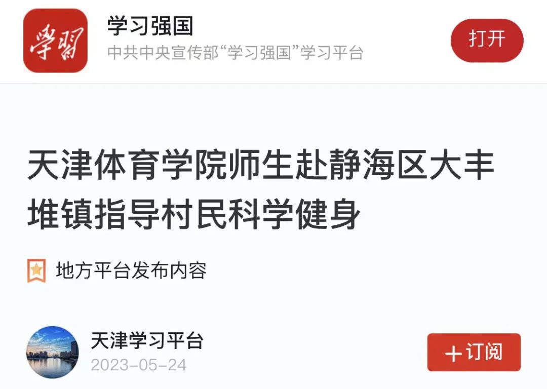 日前,学习强国“天津学习平台”报道我校深入开展学习贯彻习近平新时代中国特色社会主义思想主题教育,组织师生赴静海区大丰堆镇后明庄村,参加由市政协组织的“为群众办实事”活动,助力乡镇社区居民养成科学合理的体育运动习惯,全面提高人民群众身体素质。现全文转载。