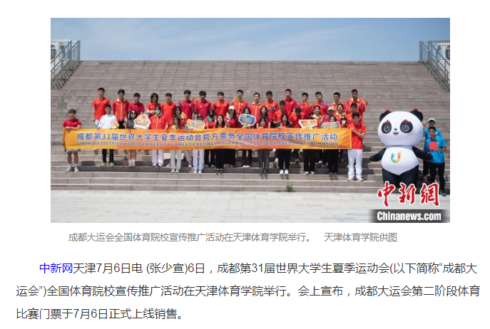 7月6日,成都第31届世界大学生夏季运动会全国体育院校宣传推广活动在我校举行。中国新闻网、天津电视台等中央和我市媒体对此进行了报道。