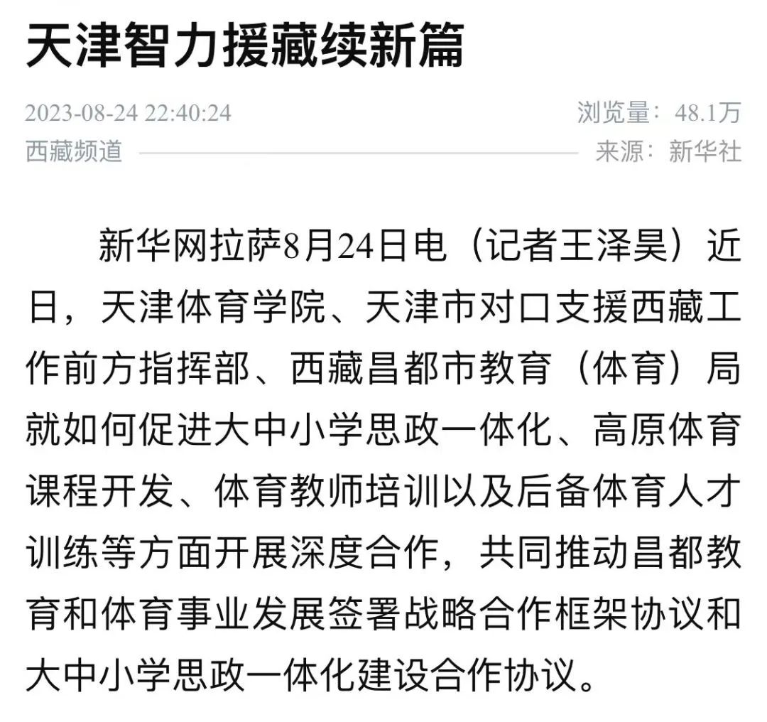 日前,新华社以“天津智力援藏续新篇”为题,报道天津体育学院、天津市对口支援西藏工作前方指挥部、西藏昌都市教育(体育)局就如何促进大中小学思政一体化、高原体育课程开发、体育教师培训以及后备体育人才训练等方面开展深度合作,共同推动昌都教育和体育事业发展签署战略合作框架协议和大中小学思政一体化建设合作协议。现全文转载。