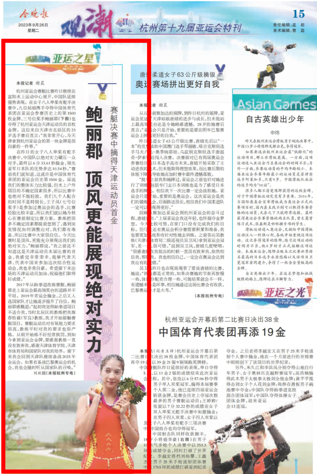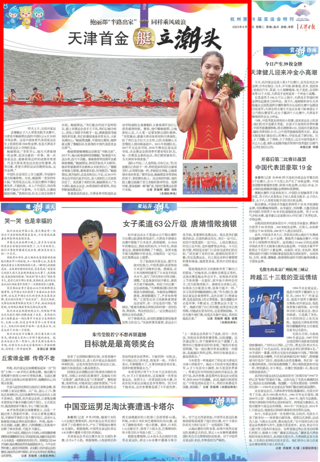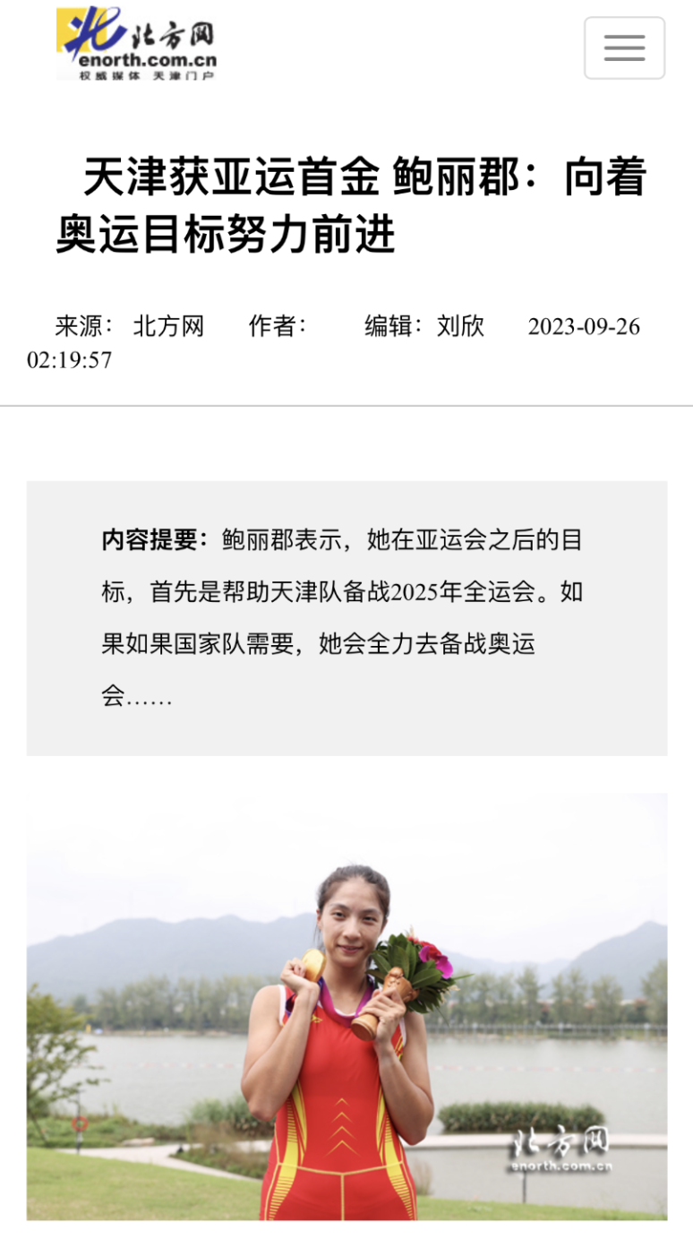 9月25日,杭州第19届亚运会赛艇女子八人单桨有舵手决赛中,我校学子鲍丽郡充分发挥技战术水平,与队友协同配合、不畏强手、顽强拼搏,以绝对优势第一条艇冲过终点,摘得该项赛事金牌。这是中国体育代表团在亚运会上收获的第1500枚金牌,是天津在本届亚运会上获得的首金。央视新闻、新华社客户端、中国新闻网、《天津日报》、津云、北方网、《今晚报》、津门教育等中央和我市多家媒体对此进行了报道。