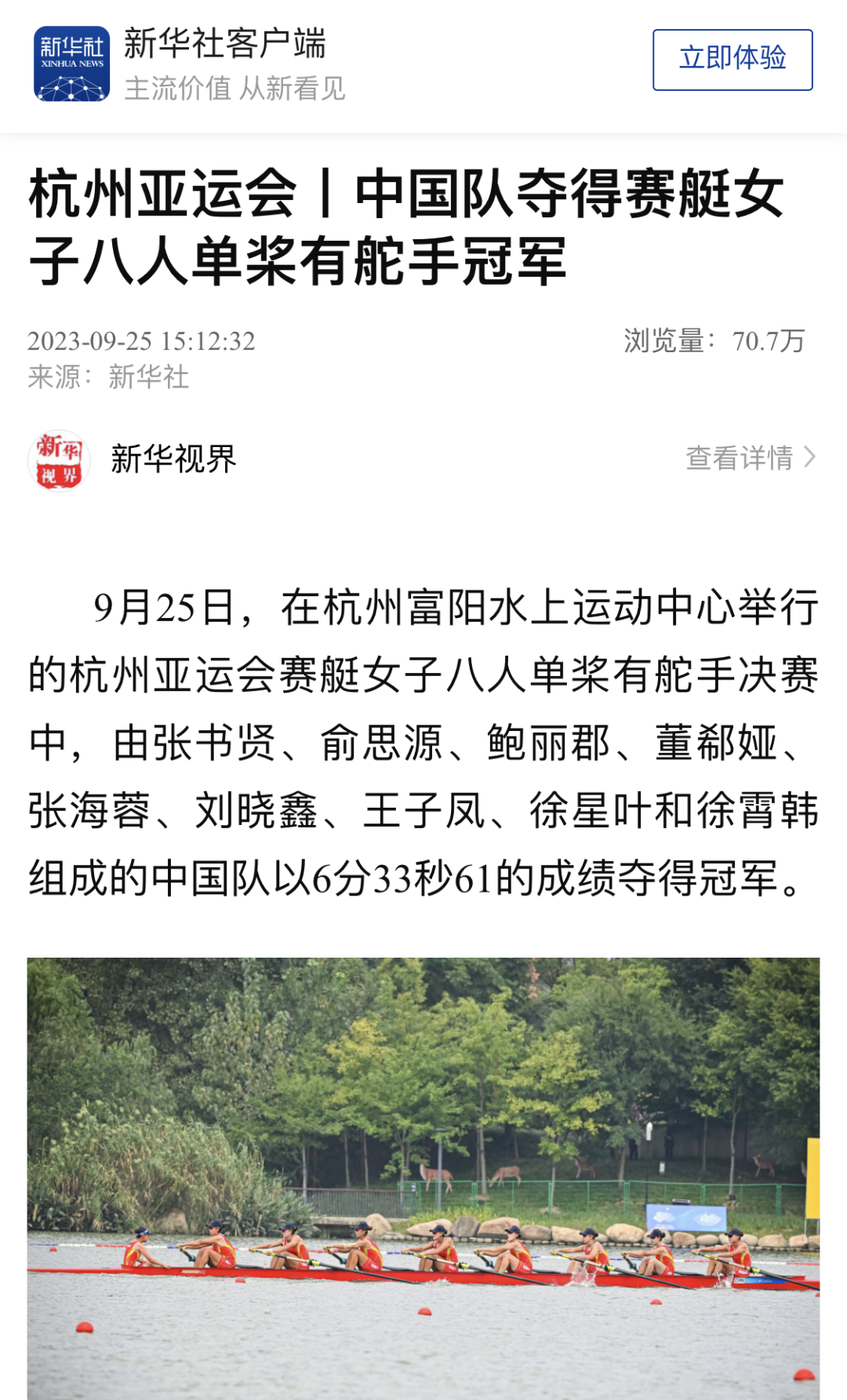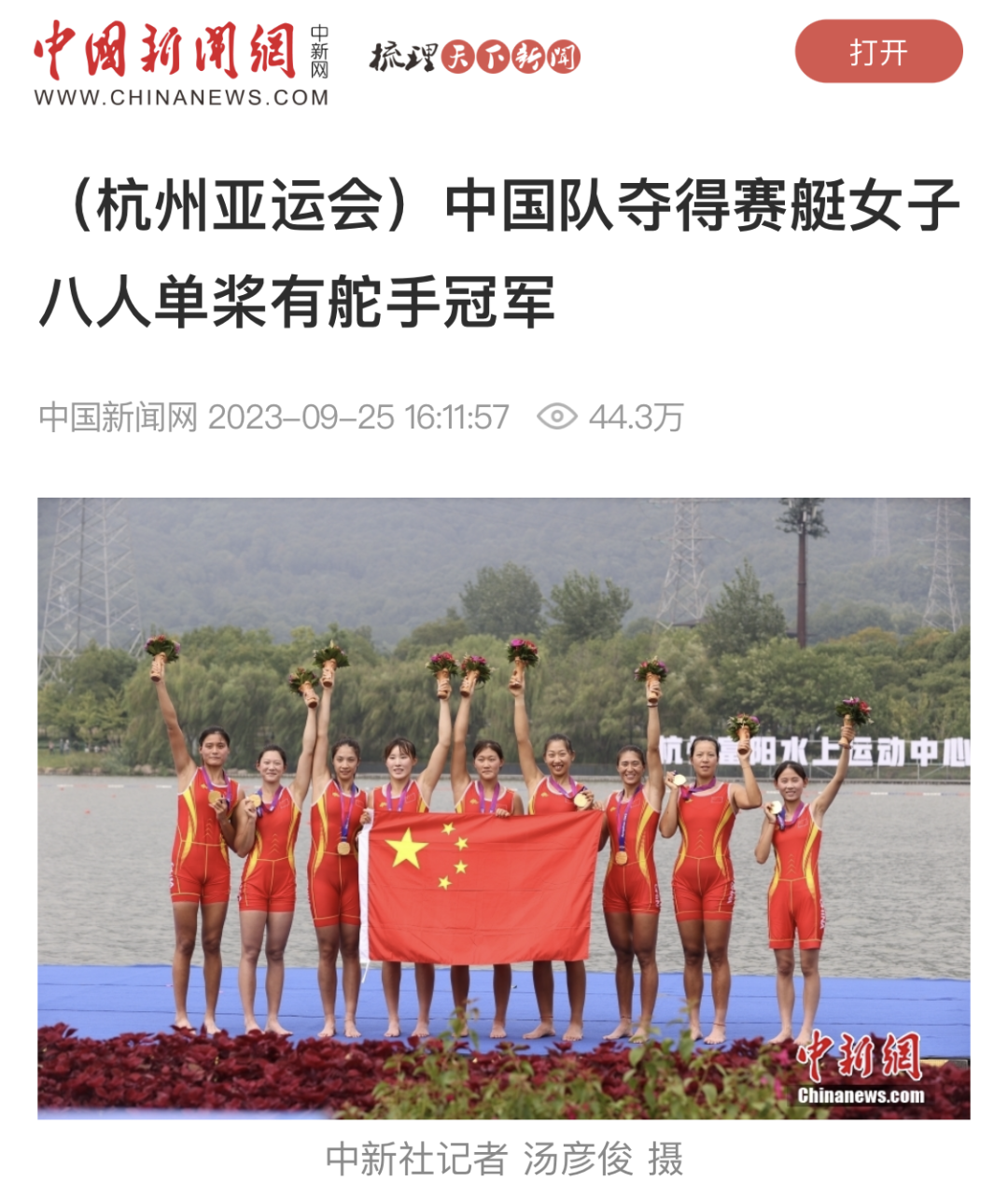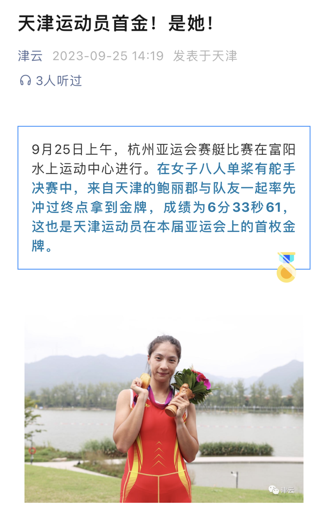 9月25日,杭州第19届亚运会赛艇女子八人单桨有舵手决赛中,我校学子鲍丽郡充分发挥技战术水平,与队友协同配合、不畏强手、顽强拼搏,以绝对优势第一条艇冲过终点,摘得该项赛事金牌。这是中国体育代表团在亚运会上收获的第1500枚金牌,是天津在本届亚运会上获得的首金。央视新闻、新华社客户端、中国新闻网、《天津日报》、津云、北方网、《今晚报》、津门教育等中央和我市多家媒体对此进行了报道。