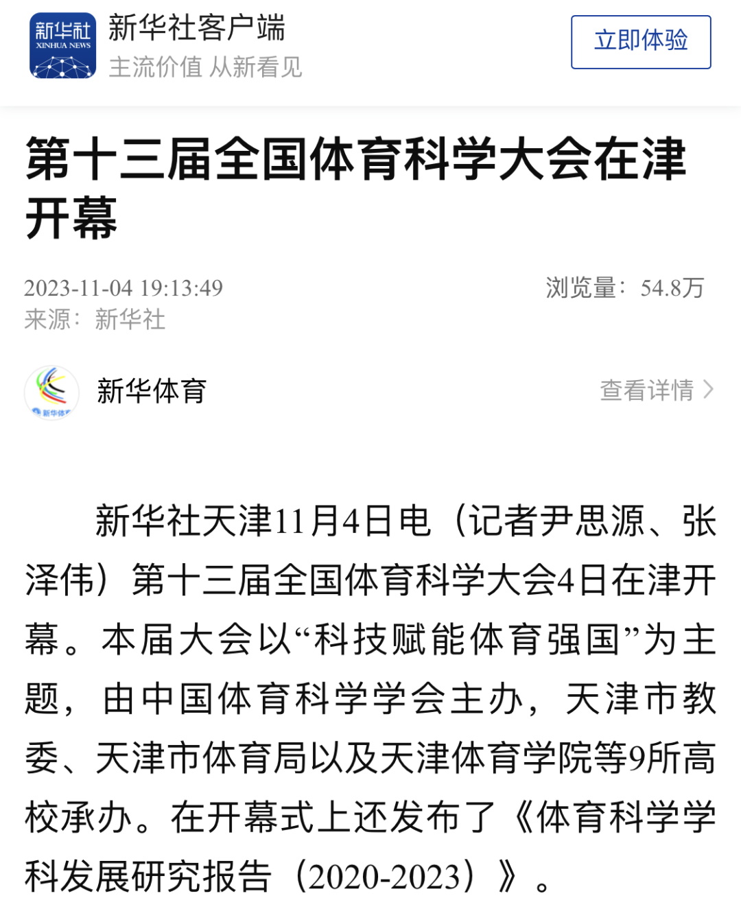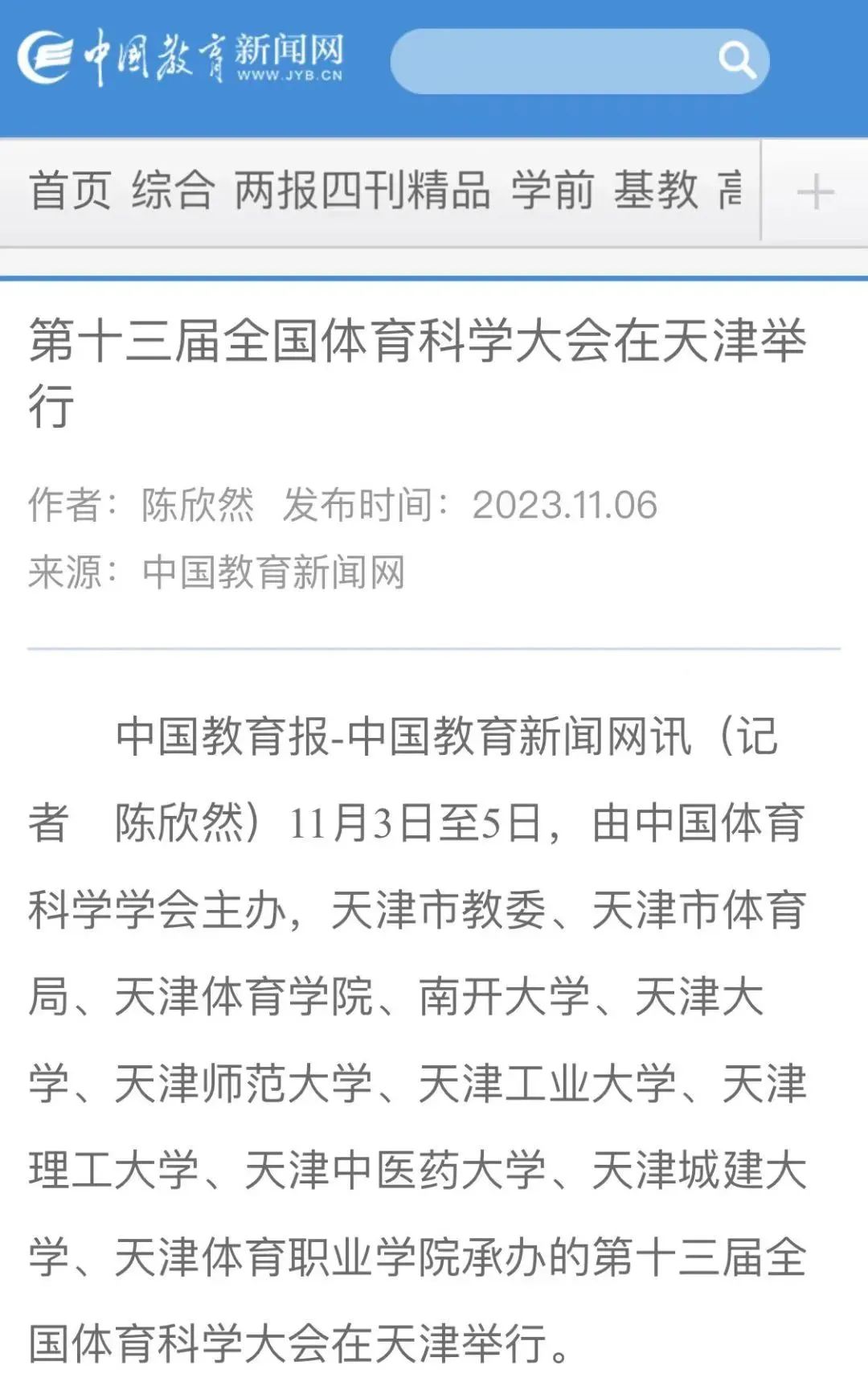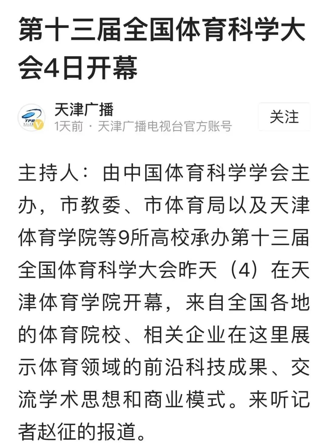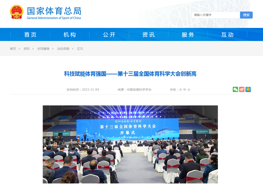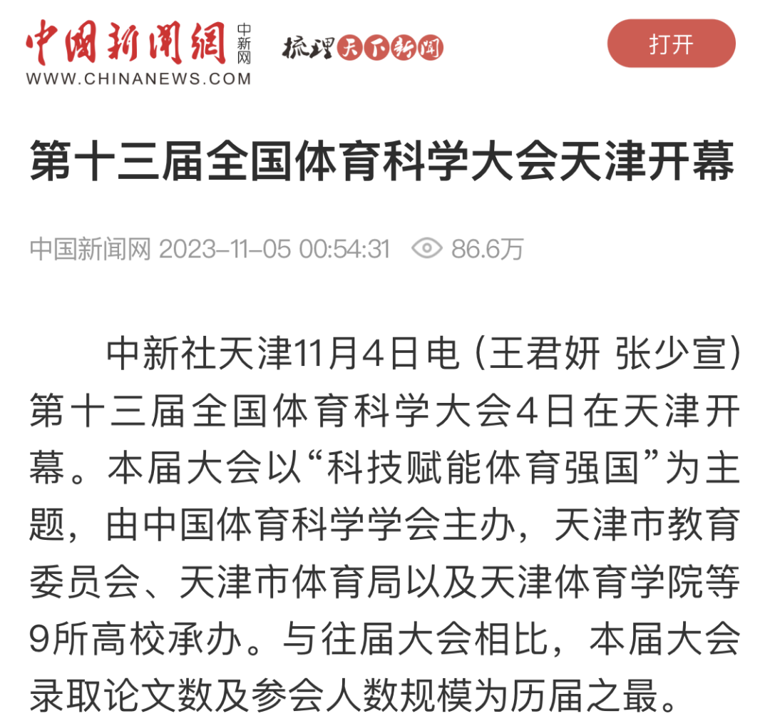 11月3日-5日,由中国体育科学学会主办,天津市教委、天津市体育局、天津体育学院、南开大学、天津大学、天津师范大学、天津工业大学、天津理工大学、天津中医药大学、天津城建大学、天津体育职业学院承办的第十三届全国体育科学大会在天津圆满举行。连日来,新华社、央广网、中国新闻网、《中国体育报》、中国教育新闻网、国家体育总局、天津电视台、《天津日报》、津云、天津广播等中央和我市多家媒体对此进行了报道。