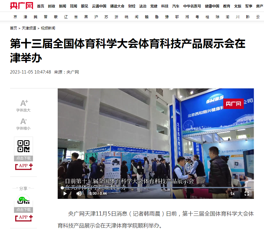 2023年11月3日下午,第十三届全国体育科学大会体育科技产品展示会在天津体育学院隆重开幕。新华社、央广网、国家体育总局官网、津云、北方网等中央和我市多家媒体对此进行了报道。