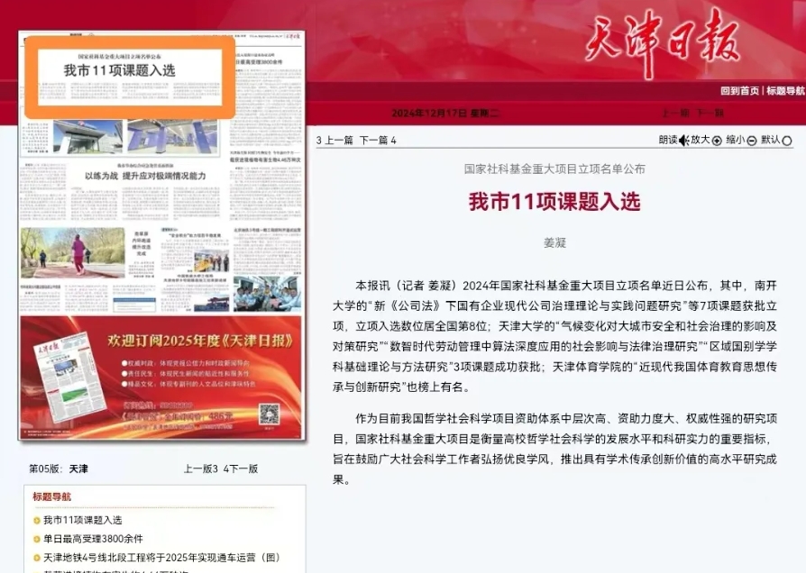 本报讯(记者 姜凝)2024年国家社科基金重大项目立项名单近日公布,其中,南开大学的“新《公司法》下国有企业现代公司治理理论与实践问题研究”等7项课题获批立项,立项入选数位居全国第8位;天津大学的“气候变化对大城市安全和社会治理的影响及对策研究”“数智时代劳动管理中算法深度应用的社会影响与法律治理研究”“区域国别学学科基础理论与方法研究”3项课题成功获批;天津体育学院的“近现代我国体育教育思想传承与创新研究”也榜上有名。