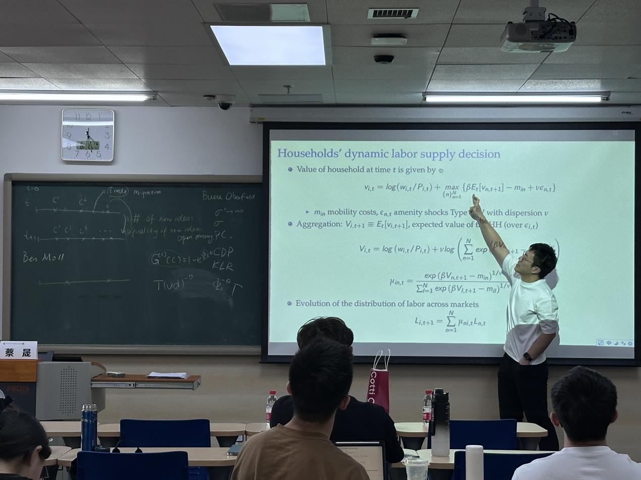 在本次短期课程中,蔡晟老师首先详细讲解了国际贸易领域模型中的技术概率假设,以及在不同市场结构中如何决定不同的一般均衡结果。其次,蔡老师深入阐述了囊括匹配的一般均衡框架并将其拓展至开放经济。最后,基于课程内容,蔡老师结合自己的论文Mechanics of Spatial Growth,具体展示了该模型与方法在实际中的应用。