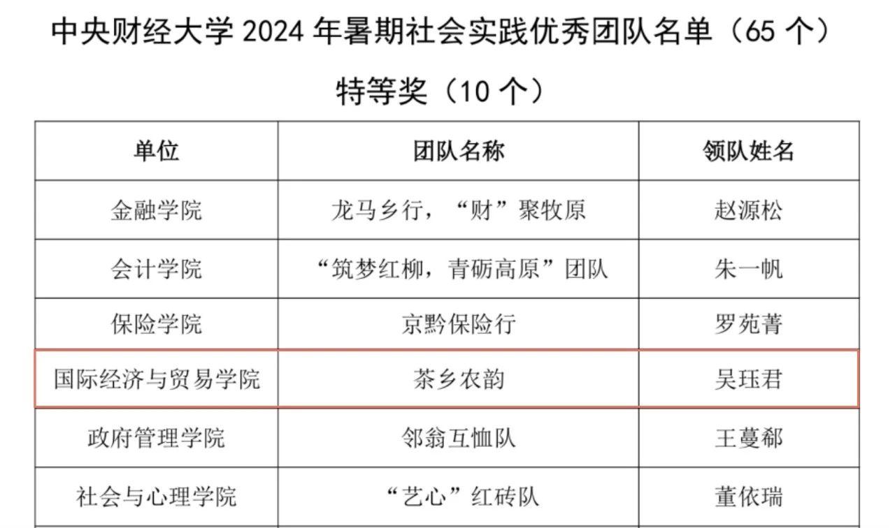 为全面贯彻落实党的二十大精神,争做有理想、敢担当、能吃苦、肯奋斗的新时代好青年,我院”一院一品”项目“茶乡农韵”支队在“财经报国青年力行”2024年暑期社会实践中获得校级特等奖、院级一等奖。依托实践成果,团队积极参加全国大学生暑期实践展示活动、三下乡、暑期实践微视频大赛以及首都大学生暑期实践等多项活动比赛,用报告、视频、演说等多种形式,把团队的实践成果转化为乡村振兴的动力。实践中,团队力求“融会贯通”——利用财税、经济、金融和国贸等不同背景财经知识,从宏观政策、金融工具到企业出海探寻旺苍茶产业破局之道。成果上,团队积极“择善而从”——实地调研学习武夷山茶产业优秀发展经验,为旺苍县茶产业发展提供可借鉴的思路和经验;追求“知行合一”——深入田间地头、茶园深处找出问题的真相和解决之道。