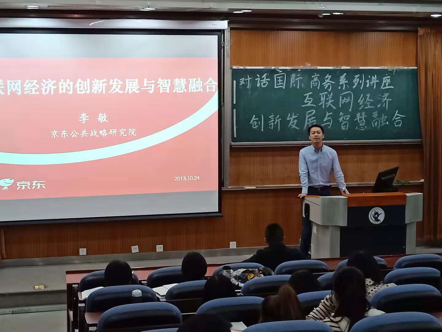 2018年10月24日晚,“对话国际商务”系列讲座第十场在沙河校区东区学院楼3号楼222教室成功举行。本场讲座非常荣幸的邀请到京东公共战略研究院高级研究院李敏博士担任主讲嘉宾。李敏博士的主要研究方向包括互联网经济、企业战略、电子商务等,本次主讲的题目为“互联网经济的创新发展与智慧融合”。讲座由国际经济与贸易学院国际商务系主任霍达副教授主持。