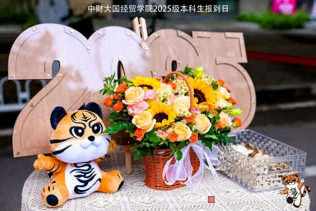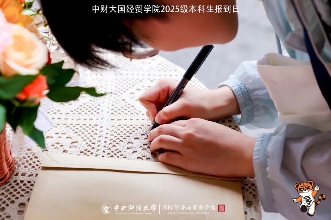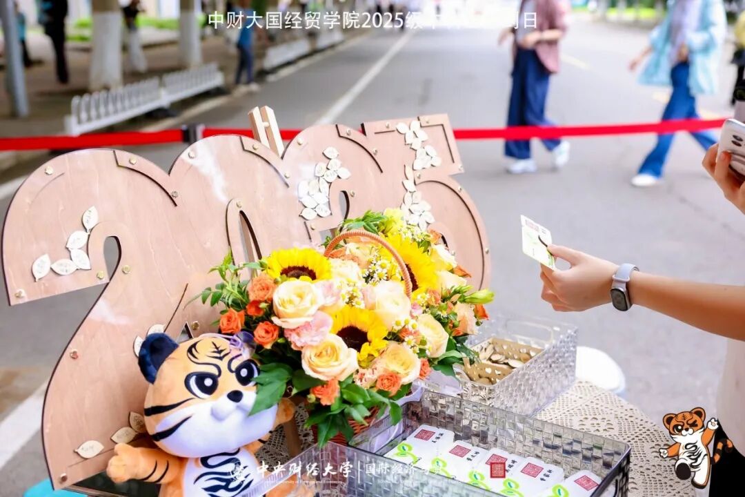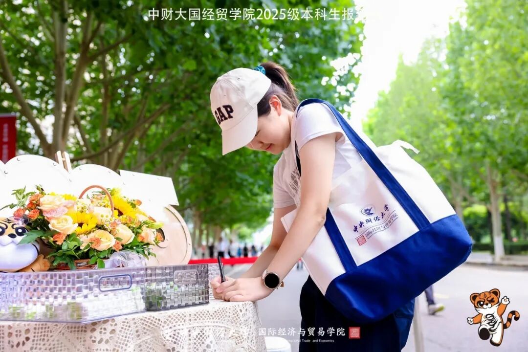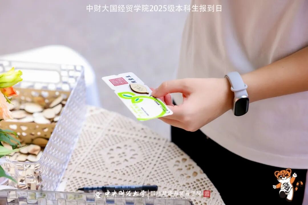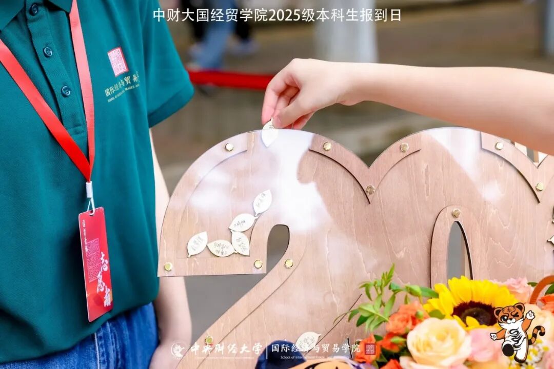 此次迎新,学院特意为新生同学们准备了迎新纪念礼物。志愿者们赠予新生印有国贸学院吉祥物贸贸虎的帆布袋、精致的学院徽章、玲珑的贸贸虎钥匙扣、学院特别编制的《茂才易学,四季耕读:国际经济与贸易学院本科生分年级发展指南》,以及印有新生名字的“种子门票”。“种子门票”放入泥土中可抽芽生枝,预示着梦想的种子将在国贸学院的沃土中生根发芽。新生将带着美好的祝愿,踏上大学之旅。此外,新生们在木刻叶片上签名,投入形为“2025”的透明容器。国贸学院似一棵大树,新生是一片片叶,从大树中获得养分,也为大树装点容貌。