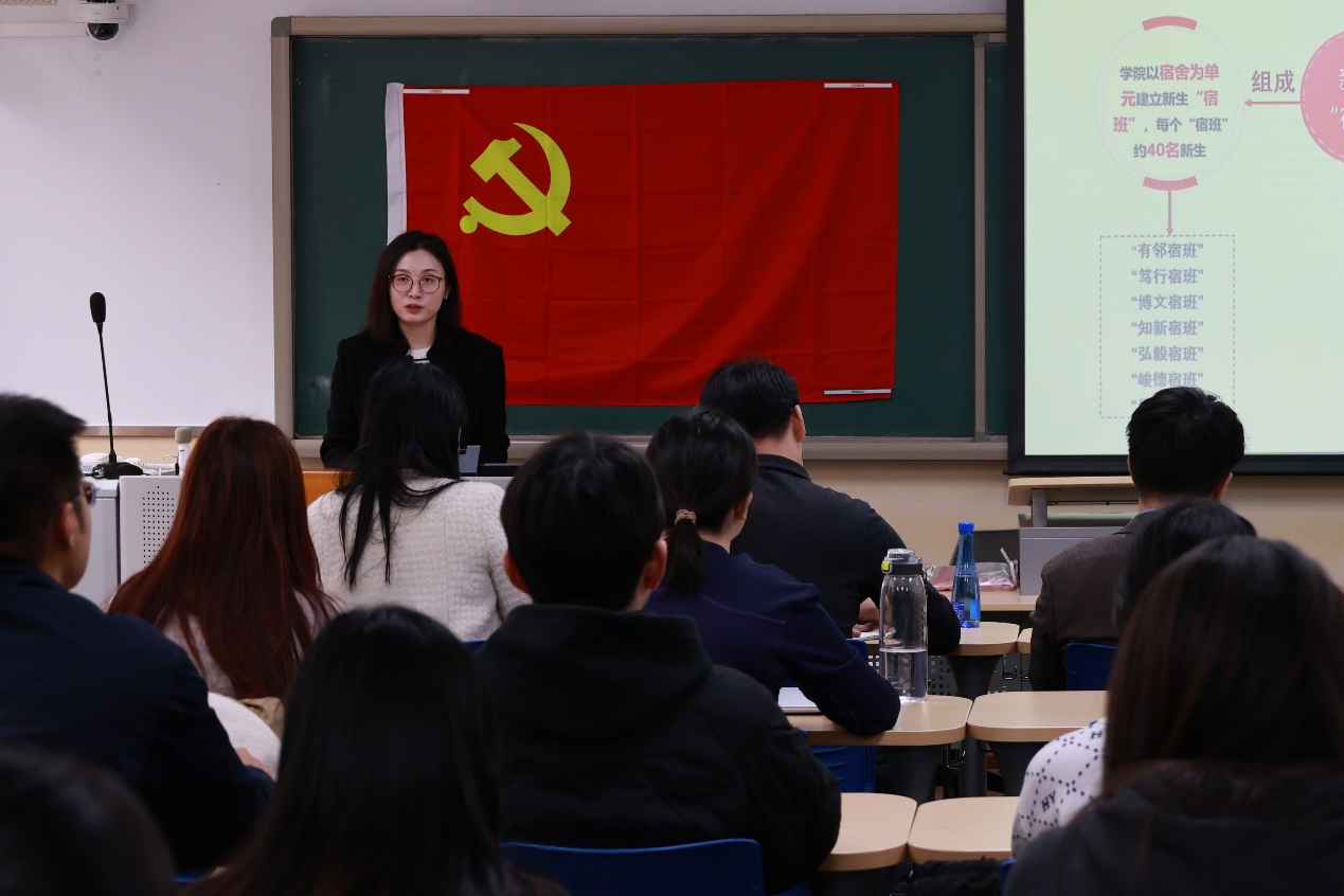 李倩老师详细介绍了红贸启航功能型党支部的建设背景与工作开展情况,红贸启航功能型党支部积极响应高校“一站式”学生社区高质量建设的要求,由优秀学生党员组成先锋导师团队,以 “1+1+X” 模式精准对接 7 个新生宿班,围绕思想引领、宿舍建设、学风涵养、身心健康等方面赋能新生成长。她分析了当前工作的成果、存在的挑战、问题的原因,并指出后续先锋导师需通过精准挖掘新生需求、优化交流互动模式等举措提升帮扶实效。