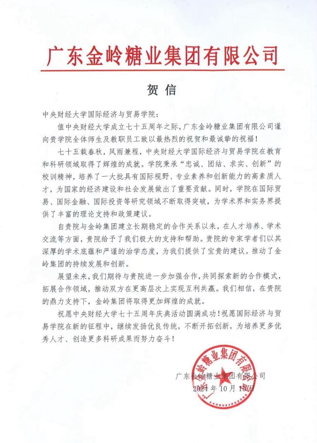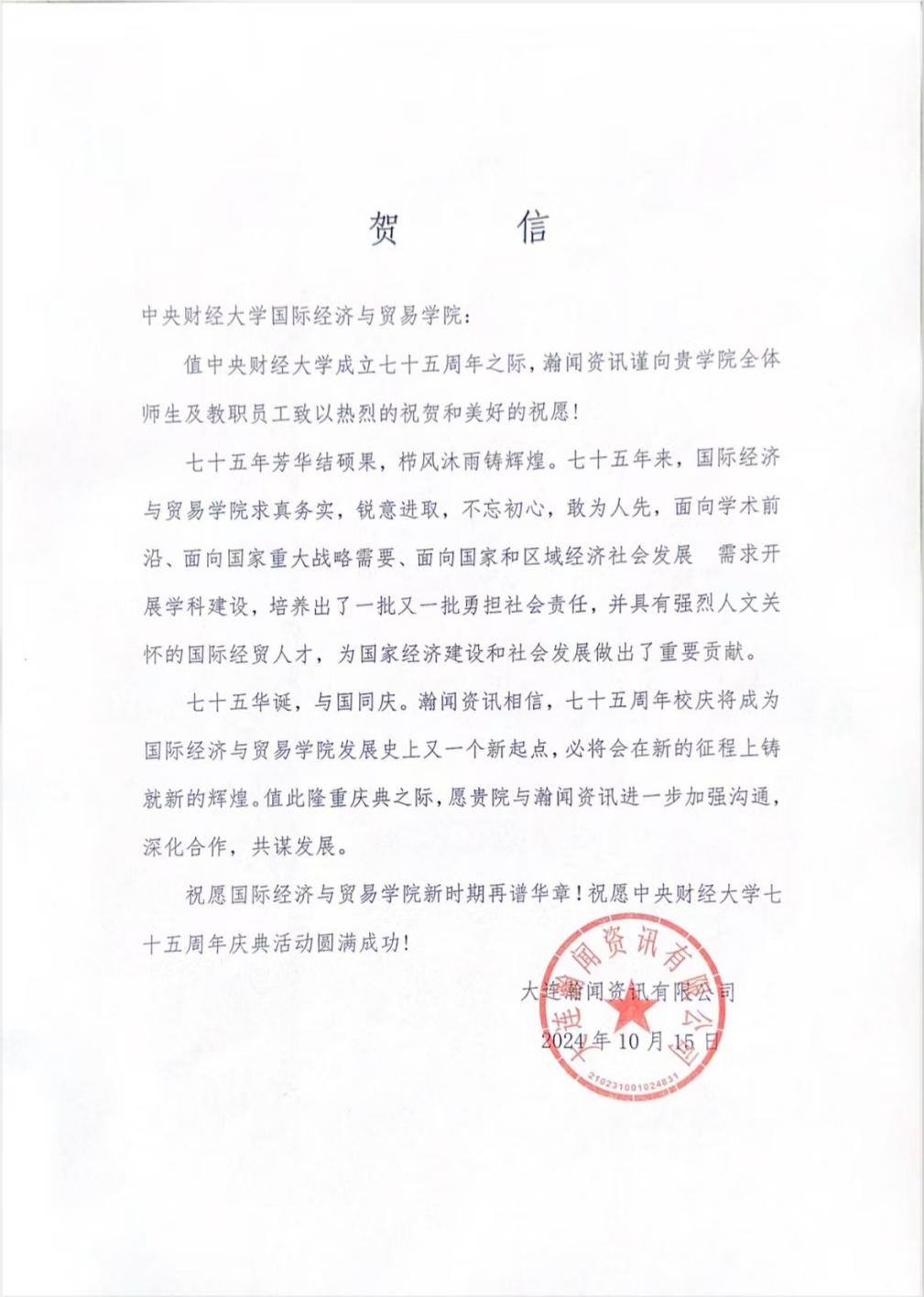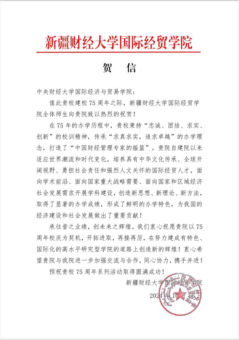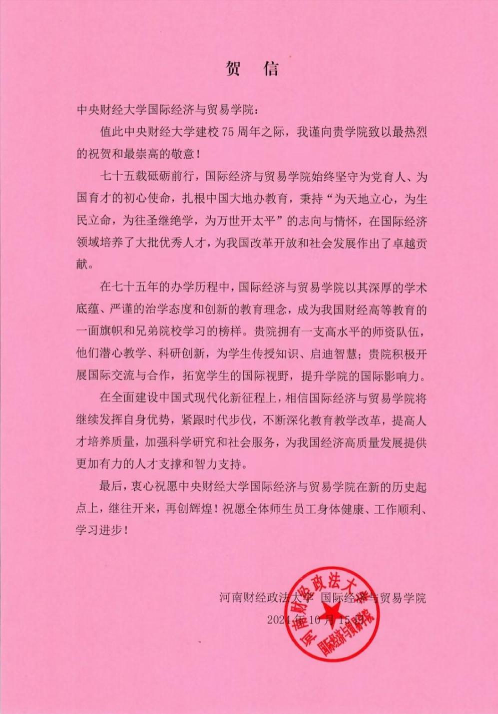 七十五载弦歌不辍,七十五载春华秋实。2024年,中央财经大学迎来75周年华诞,学校和学院的发展离不开社会各界朋友的关心和支持。10月16日下午,国际经济与贸易学院收到河南财经政法大学国际经济与贸易学院、新疆财经大学国际经贸学院、大连瀚闻资讯有限公司、广东金岭糖业集团有限公司为我校校庆75周年发来的贺信。这是我院收到社会各界发来的第一批贺信。