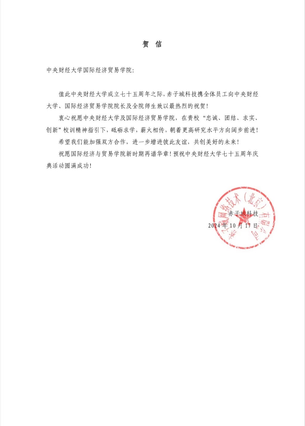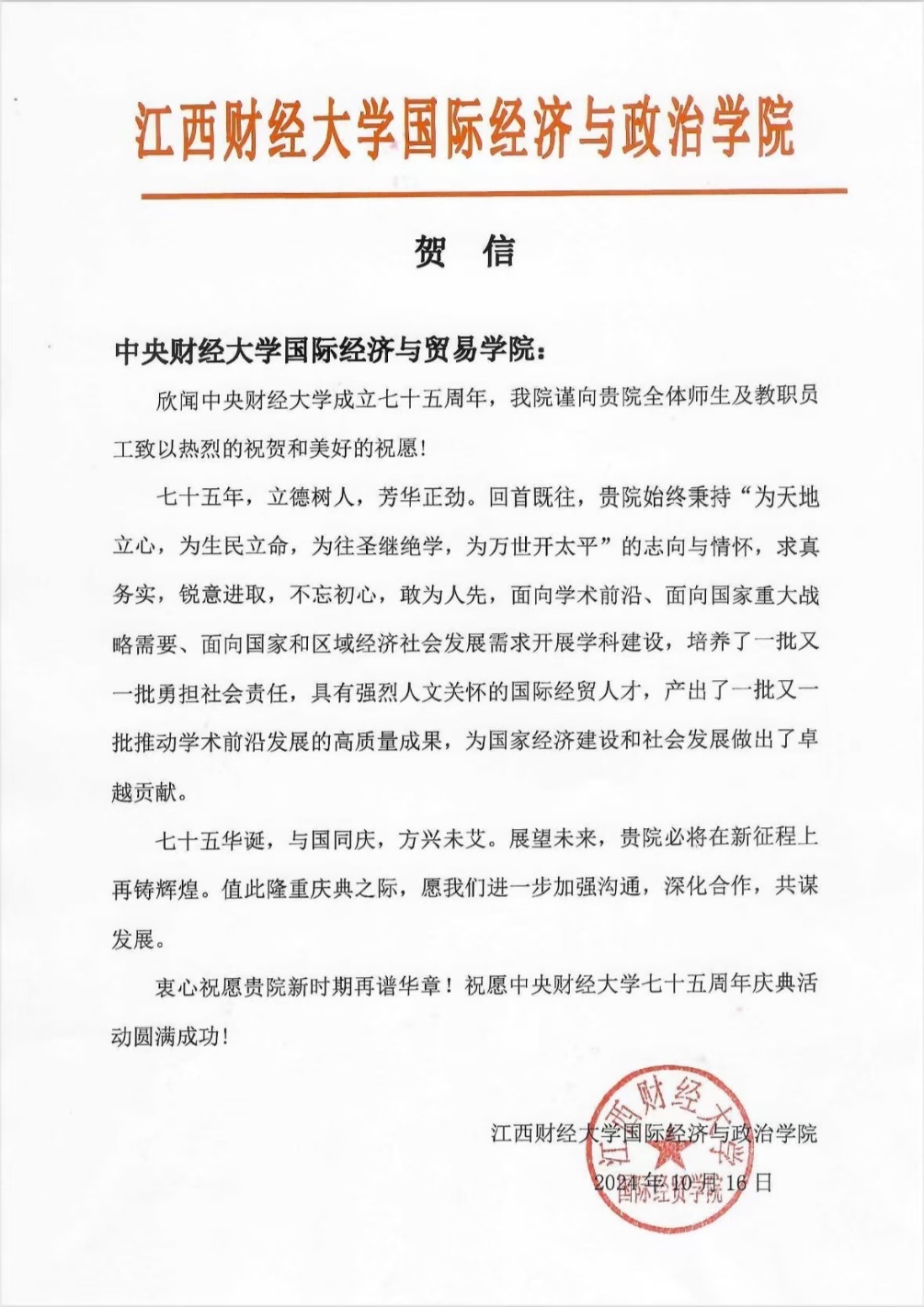 七十五载弦歌不辍,七十五载春华秋实。2024年,中央财经大学迎来75周年华诞,学校和学院的发展离不开社会各界朋友的关心和支持。10月17日,国际经济与贸易学院收到经济科学出版社、江西财经大学国际经济与政治学院、赤子城科技为我校校庆75周年发来的贺信。