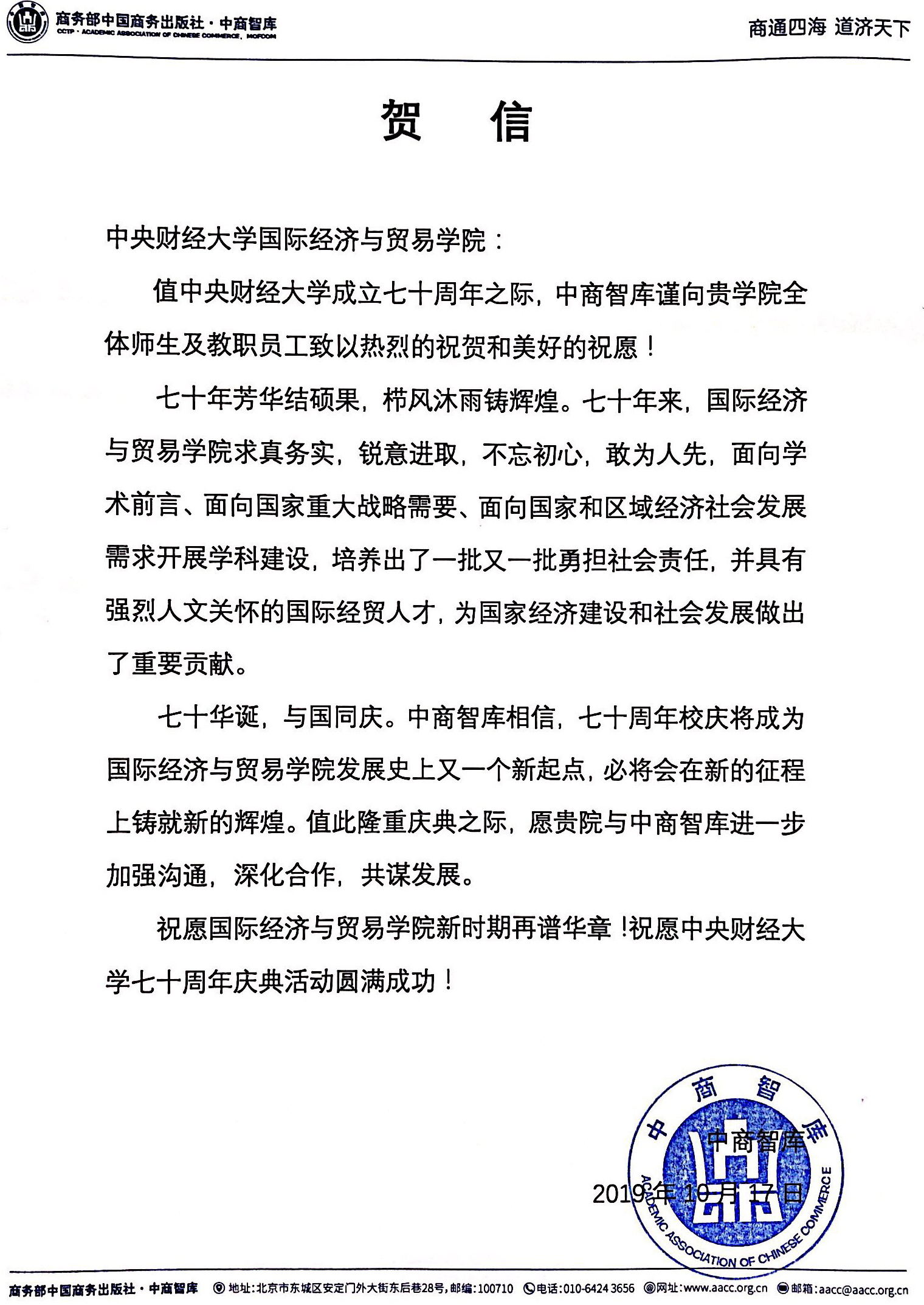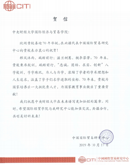 10月18日下午,学院收到来自中国贸易研究中心、中商智库、大连瀚闻资讯有限公司为我校校庆70周年发来的第二批贺信。