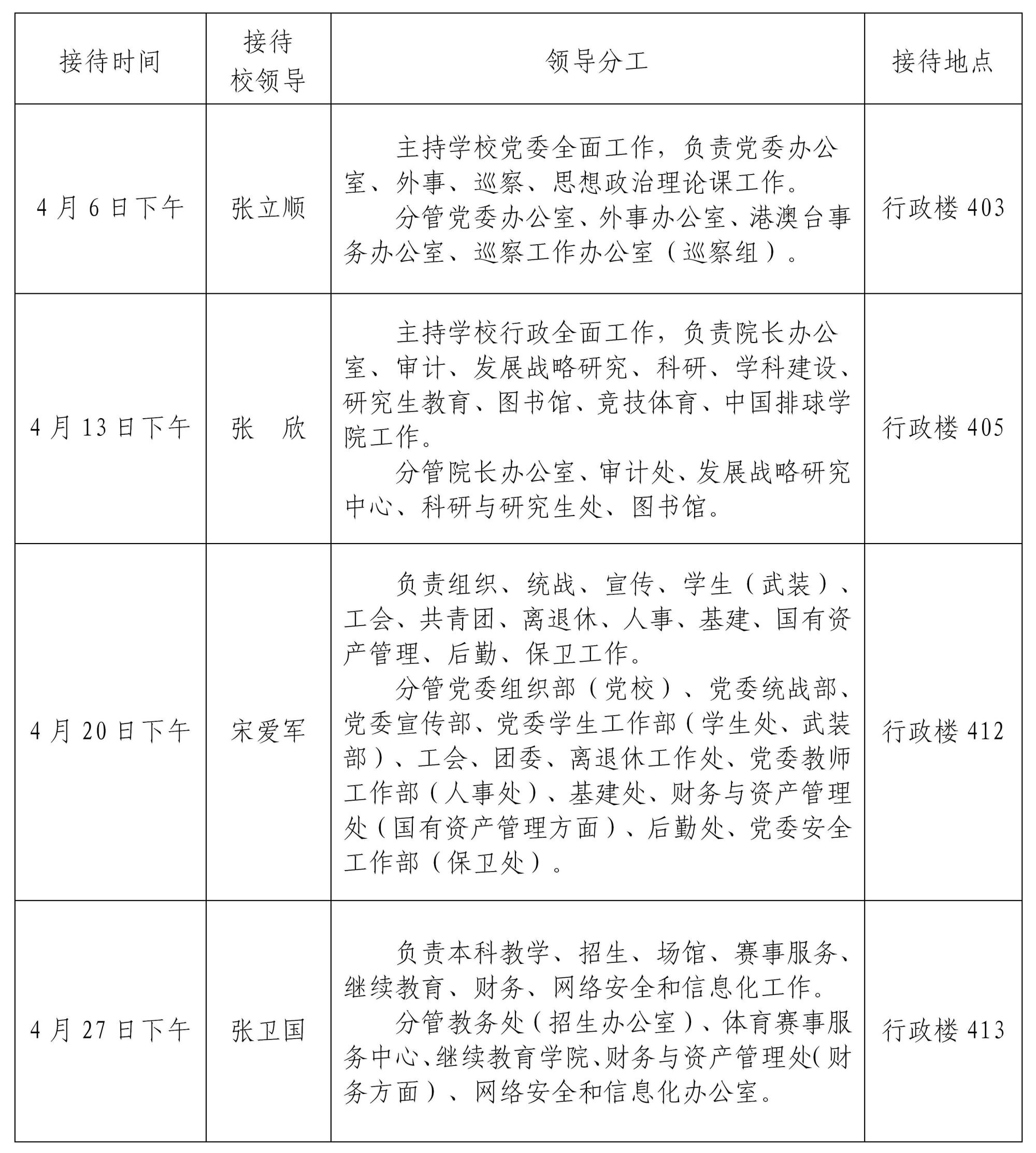 根据《天津体育学院领导干部接待日制度》规定及学校近期工作安排,现将2023年4月校领导接待师生来访安排通知如下: