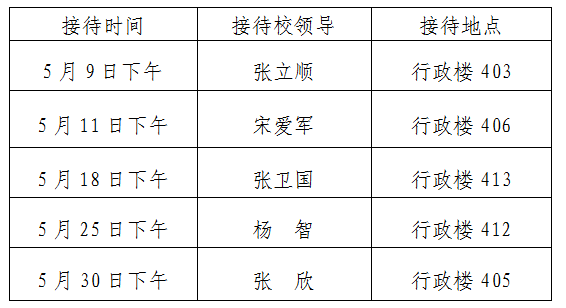 根据《天津体育学院领导干部接待日制度》规定及学校近期工作安排,现将2023年5月校领导接待师生来访安排通知如下: