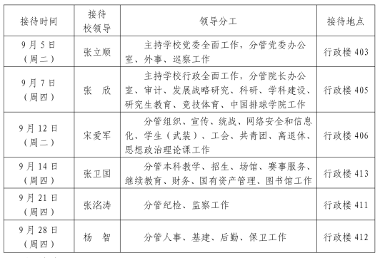 根据《天津体育学院领导干部接待日制度》规定及学校近期工作安排,现将2023年9月校领导接待师生来访安排通知如下:相关事项: