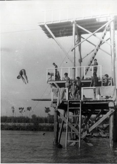 1959年,为备战第一届全运会,我院游泳运动员在自己搭建的跳水台训练