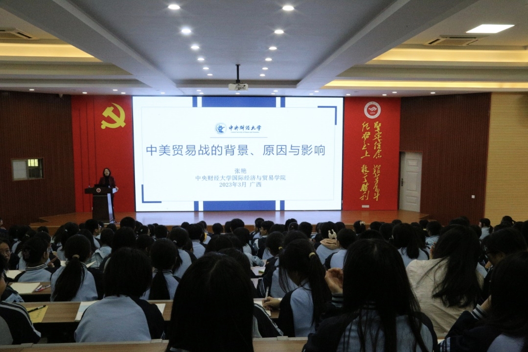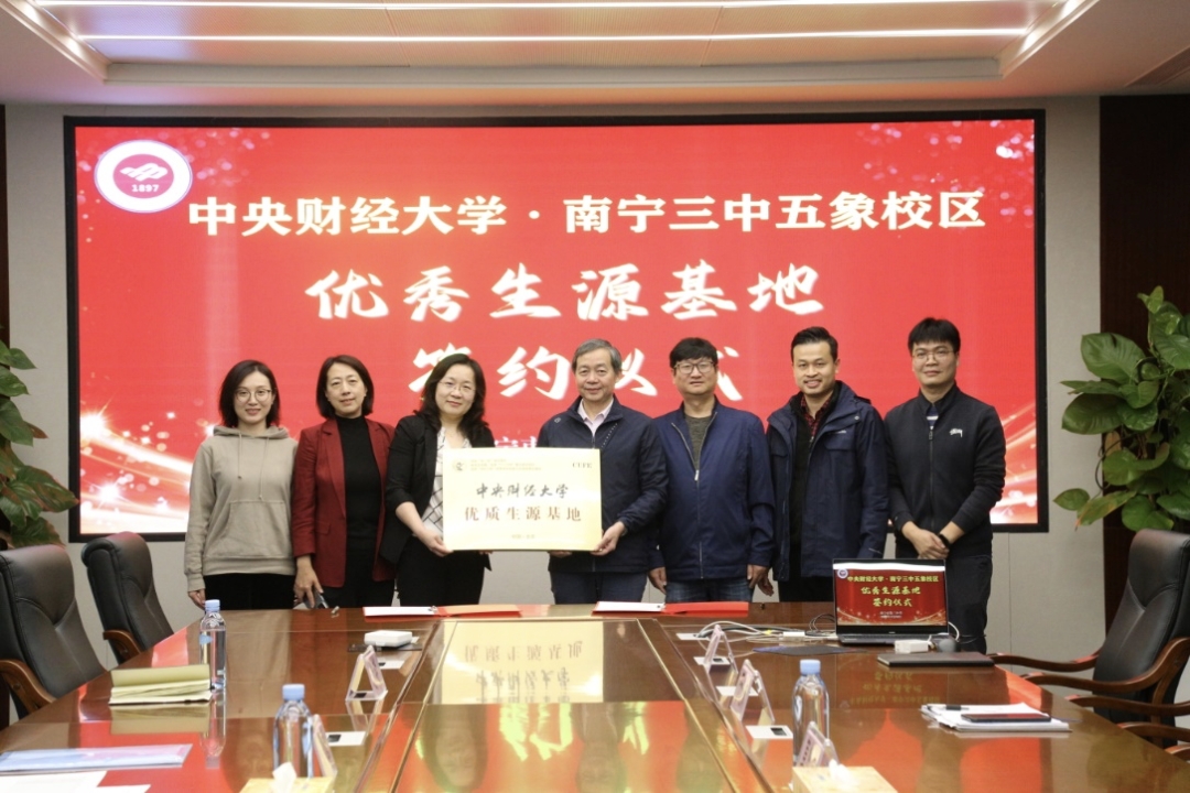 3月30日下午,老师们赴南宁三中(五象校区)开展招生宣传工作。五象校区副校长莫怡祥、教务处主任于法锋等老师出席了本次活动。首先,双方就如何加强招生宣传实效、吸引优质生源报考中央财经大学进行了充分的沟通,随后双方代表签署了《中央财经大学优质生源基地建设协议书》,并举行了优质生源基地挂牌仪式。在之后的“龙马讲堂进校园”的活动中,张艳教授做了题为《中美贸易战的背景、原因和影响》的学术讲座,学生们现场互动频繁,气氛热烈。