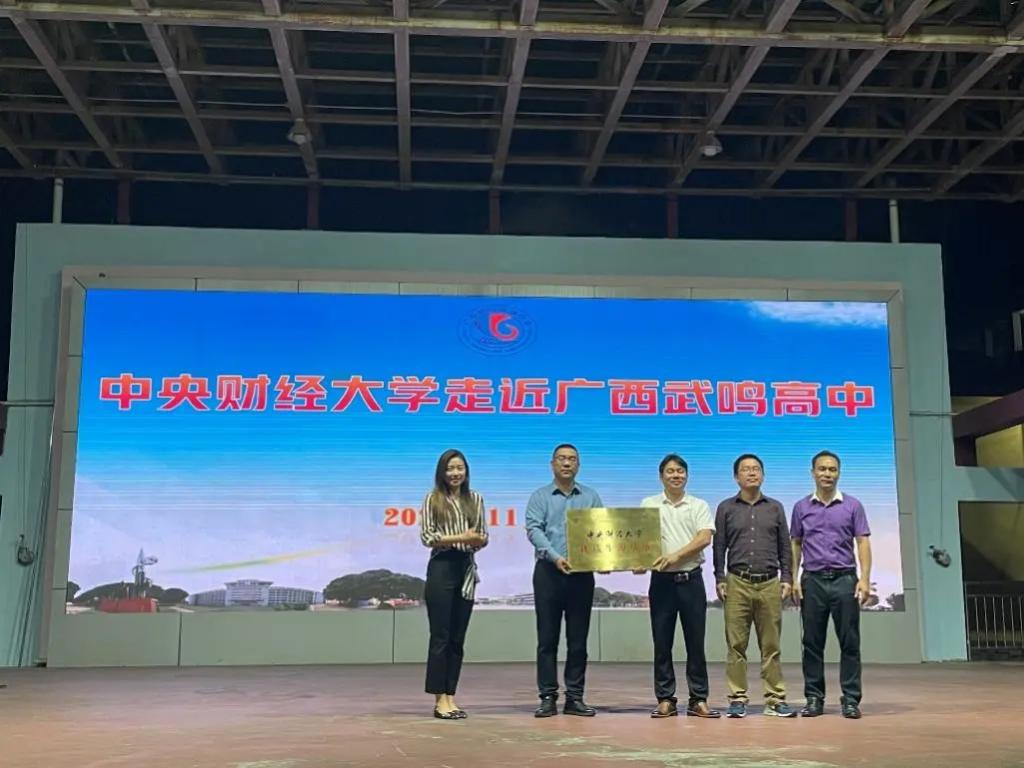 11月10日晚,招生团队在南宁市武鸣高级中学(武鸣高中)举办挂牌签约仪式,并举行主题讲座。武鸣高中校长潘东海、副校长何建郡、教务处主任廖容出席活动。在廖容主任的带领下,访问一行参观了武鸣高中的校园和校史馆,了解了中财大在武鸣高中历年的招生情况,双方充分探讨未来如何就招生工作达成长期友好合作关系。随后,我校代表国际经济与贸易学院党委副书记杨武和武鸣高中代表潘东海签署了《中央财经大学优质生源基地建设协议书》,并举行优质生源基地授牌仪式。最后,梅冬州教授和秦伊伦老师分别向武鸣高中高二学生和初中部学生做了学术讲座和招生宣讲,现场互动频繁,气氛热烈。