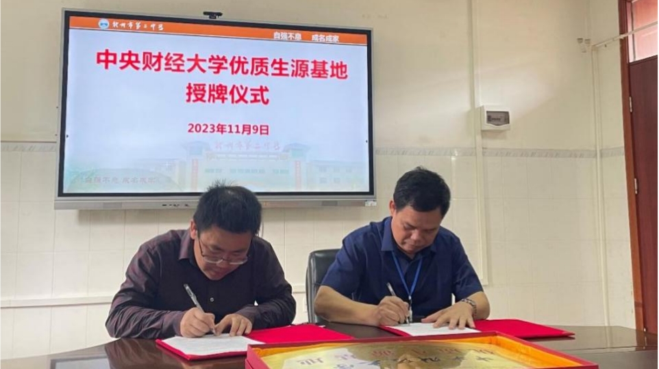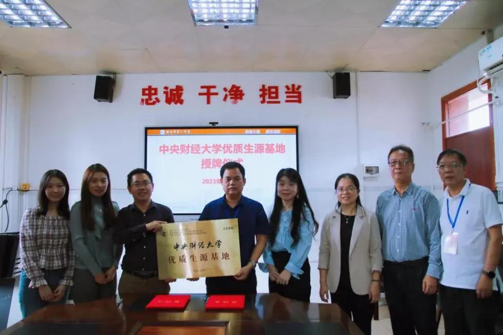 11月9日上午,招生工作团队赴钦州市第二中学参加优秀生源基地签约和挂牌仪式,钦州市第二中学党委书记李运国、副校长谢艺容、副校长周扬明、校长顾问莫裕录、校长助理谢雪峰出席活动。双方就如何加强招生宣传实效、吸引优质生源报考中央财经大学进行了充分沟通,随后中央财经大学代表梅冬州教授和钦州市第二中学代表李运国书记签署了《中央财经大学优质生源基地建设协议书》,并举行了中央财经大学优质生源基地挂牌仪式,自此,钦州市第二中学正式成为我校优质生源基地。