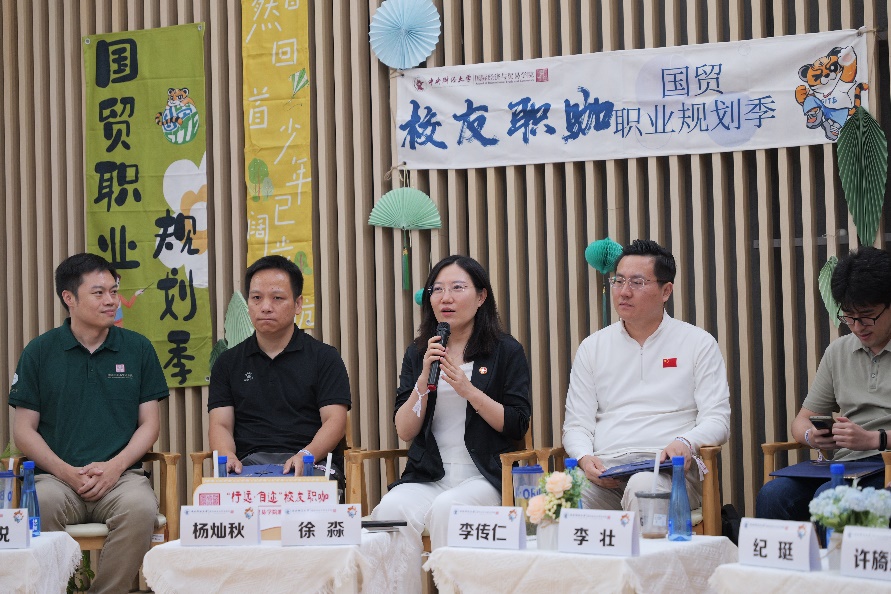 随后在各位校友与嘉宾围绕“从敲门砖到引航舵——职场通关与人生修炼”的主题展开了交流,李壮先生针对当下毕业生的求职困惑,通过分享自己的求职经历,强调了“专注”的重要性,他介绍了自己在“金融+科技”领域深耕细作的故事,鼓励在校生把握时代动态、探寻发展机遇。杨灿秋校友深情回顾了在校时光,他以自身从基层到管理岗的职业发展经历,强调 “保持学习能力是应对职场挑战的关键”,希望青年学子们在实践中打磨素养、积累认知。卢昭明校友在分享中展现了国贸学子多元化的职业发展路径,他认为,面对快速更迭的就业环境,需以开放心态勇闯不同领域,在实践中积淀经验、锤炼能力。许旖珊校友深耕国内证券研究行业,她围绕自己从在校时期到职场发展的经历,深入剖析了锚定职业目标对于她成长过程中的重要性,她以独特视角诠释国贸人的守正创新精神。李传仁校友分享了从中财本科到深造再到求职的故事,呼吁毕业生逐步发现和锻炼自己的能力,以实干促发展,善于在瞬息万变的工作环境中把握住机遇,以过硬的专业知识和优秀的工作能力,争取宝贵机会。高仁尚校友分享了个人求学经历与职业感悟,他讲到,面对业务转型挑战,唯有持续学习方能精进,他对国贸学院校友会搭建的交流平台表示感谢,并表示今后也将继续助力学院,为提升在校生就业核心竞争力贡献自身力量。李佳琪校友深入浅出地剖析了蓬勃发展的大数据产品行业,她强调,主动沟通是学习的捷径,数据分析能力是互联网行业的核心驱动力,建议同学们在专业学习中,既要夯实数据工具应用与逻辑分析的基础能力,又要培养跨场景沟通和协作能力。龚艺校友结合在互联网公司的工作经历,强调要利用实习实践、校友交流等机会,提前了解职业生态与核心胜任力,将市场分析实践与思维有机结合,紧盯市场的风向标。余纪磊校友从个人在互联网公司产品研发量化岗位的工作经历中提炼感悟,他认为,初入职场的毕业生完成从 “任务式思维” 到 “探索式思维” 的转变尤为重要。
