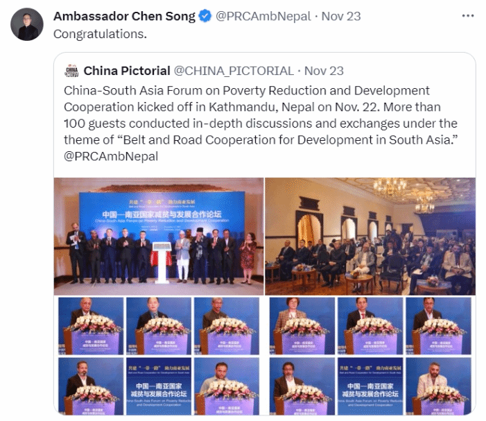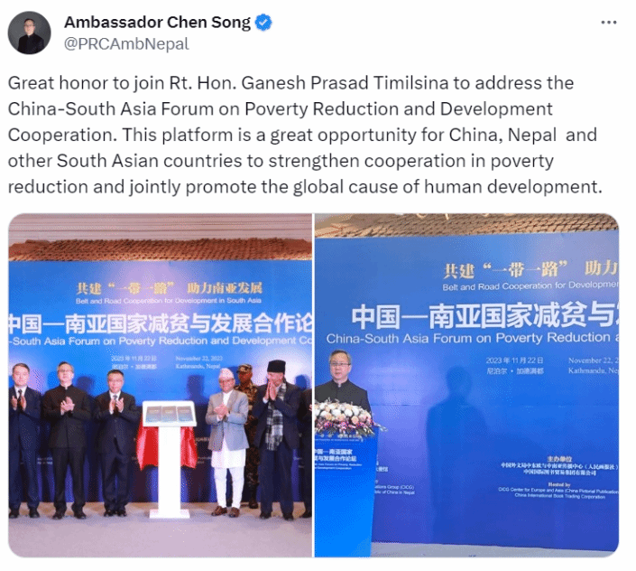 11月22日,中国南亚国家减贫与发展合作论坛在尼泊尔加德满都举办。来自中国、尼泊尔、印度、巴基斯坦、孟加拉国、斯里兰卡等国家的政府官员、外交使节、专家学者、媒体和国际组织代表百余人出席论坛。与会嘉宾围绕“共建‘一带一路’、助力南亚发展”等主题展开深入研讨交流。
