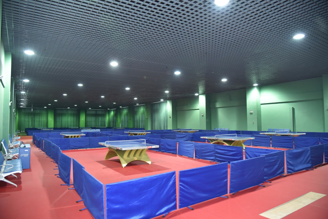 乒乓球馆建筑面积7277平方米,场地面积4868平方米,共四个球馆,72张国际标准的比赛球台,地面采用塑胶材料铺设,馆内有良好的照明系统、馆内温度和空气的流速都可以较好地控制,可承接各类乒乓球项目比赛和健身活动。